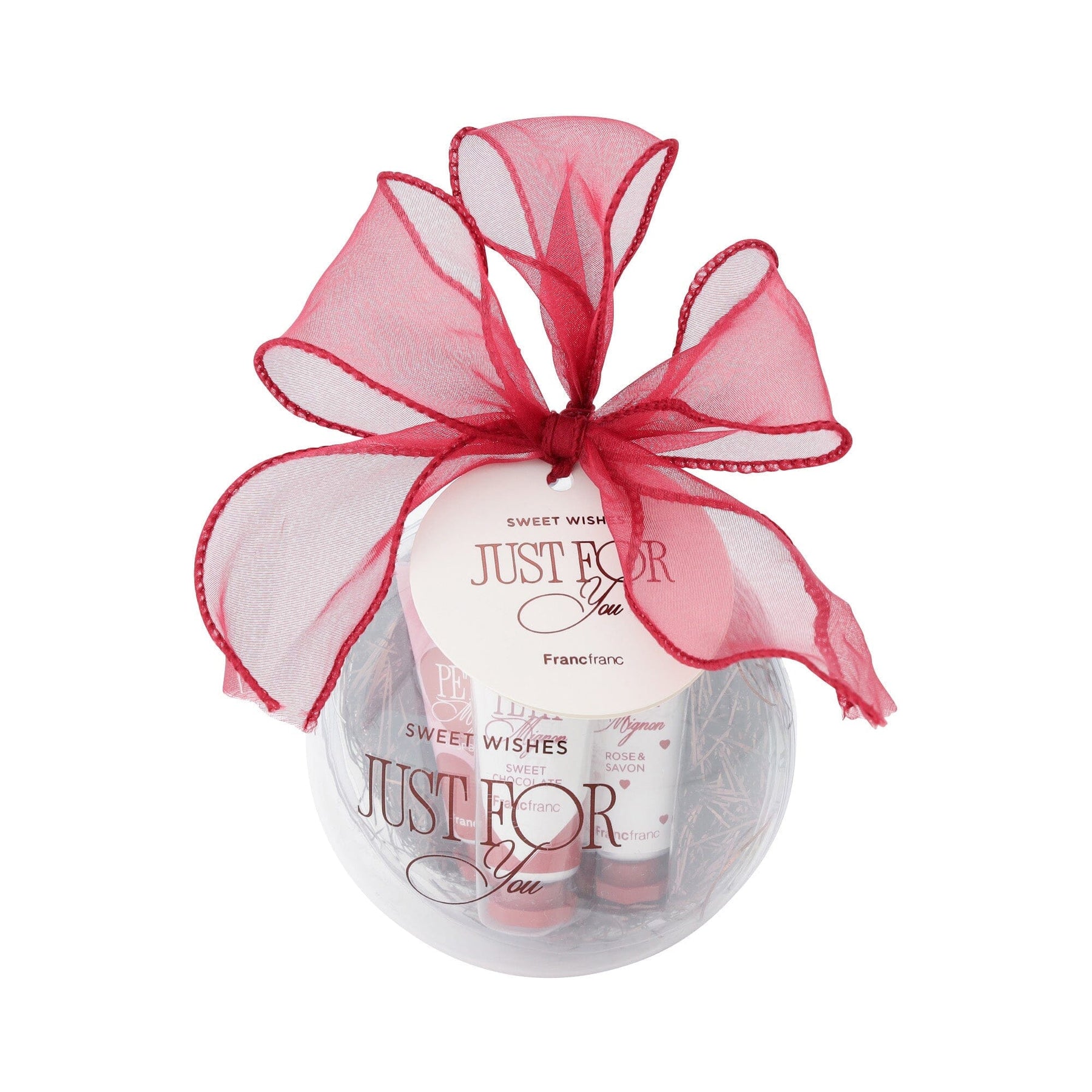 A hand cream set in a round, clear ornament-like container that comes in three different scents.Contains moisturizing ingredients to leave your hands feeling smooth.