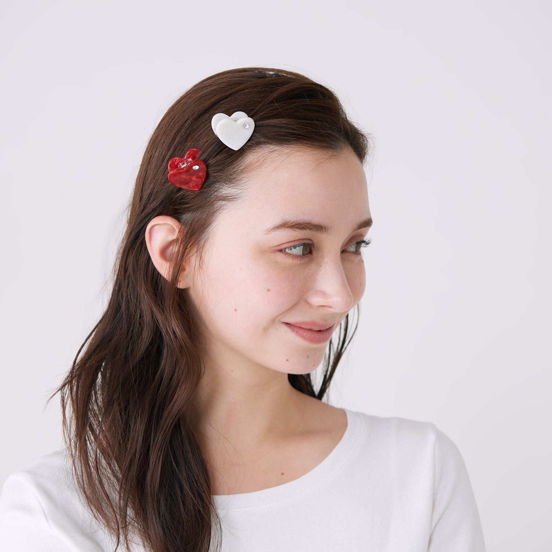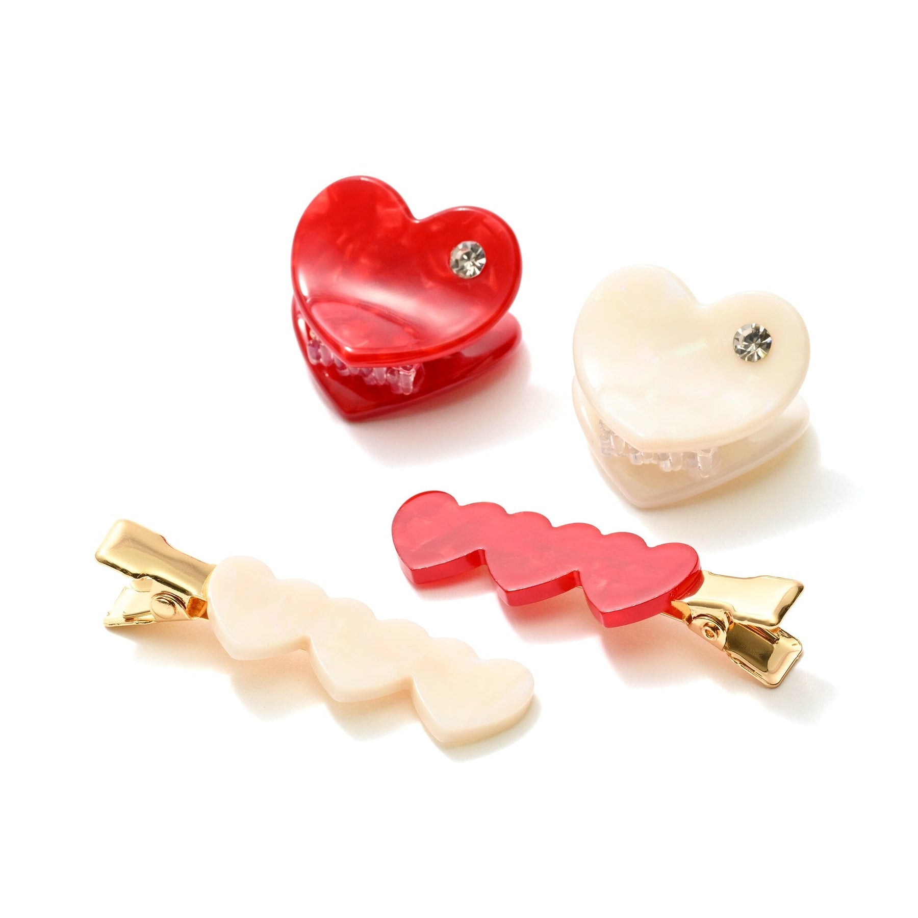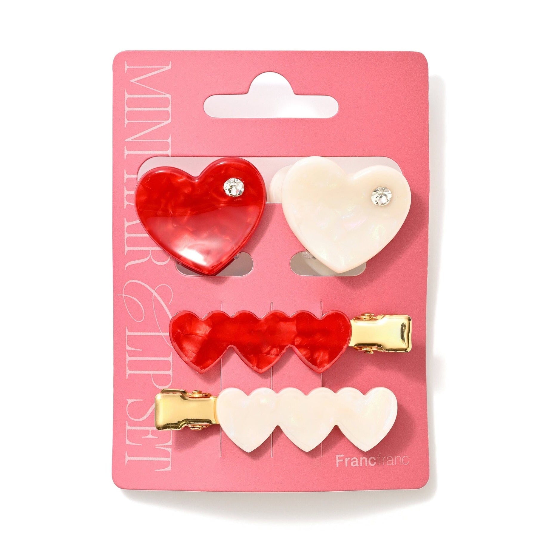 A set of cute heart-shaped bangs clips and mini hair clips.The sparkling glass beads add a cute touch.