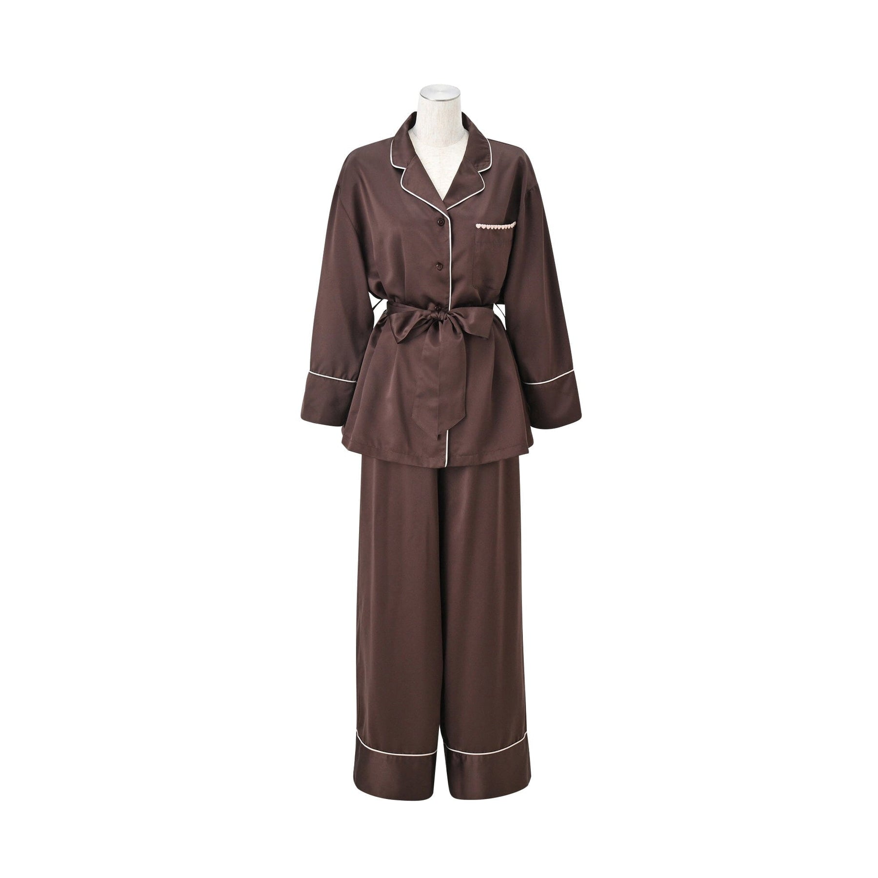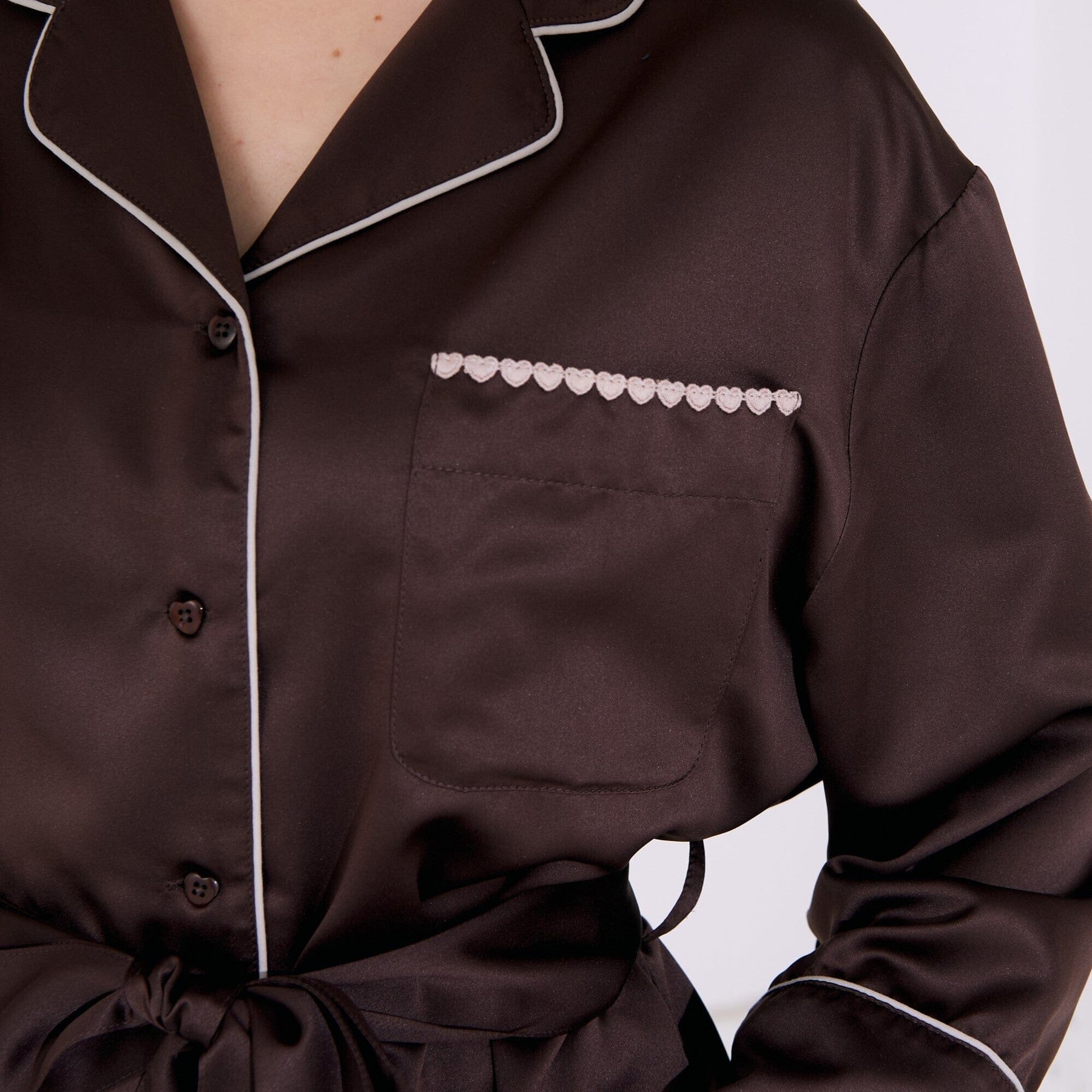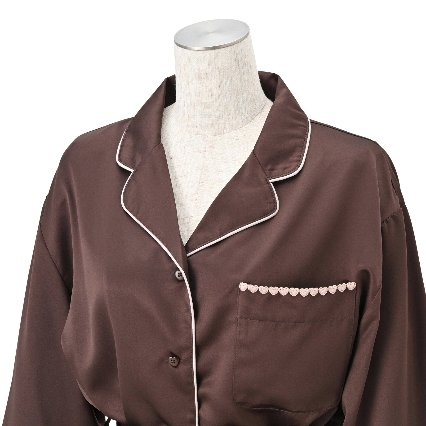 Satin pajamas with a subtle heart line on the pocket.The smooth and comfortable fabric makes them suitable for year-round wear.