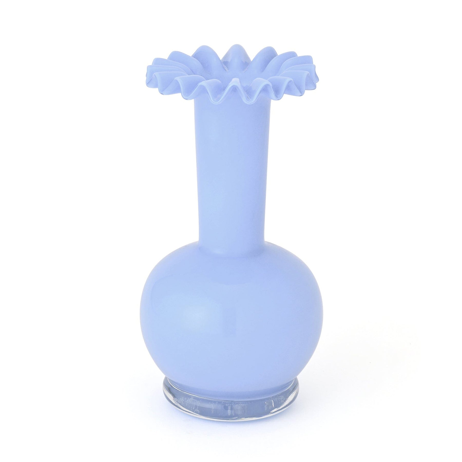 This glass flower vase features cute ruffles.