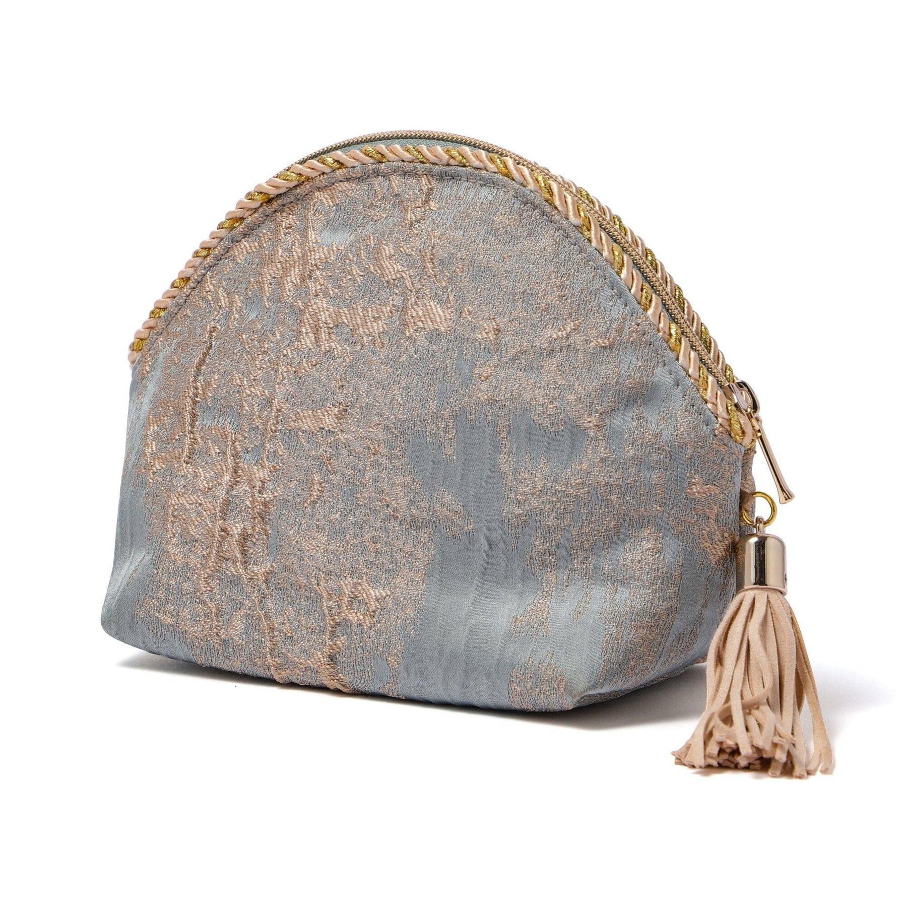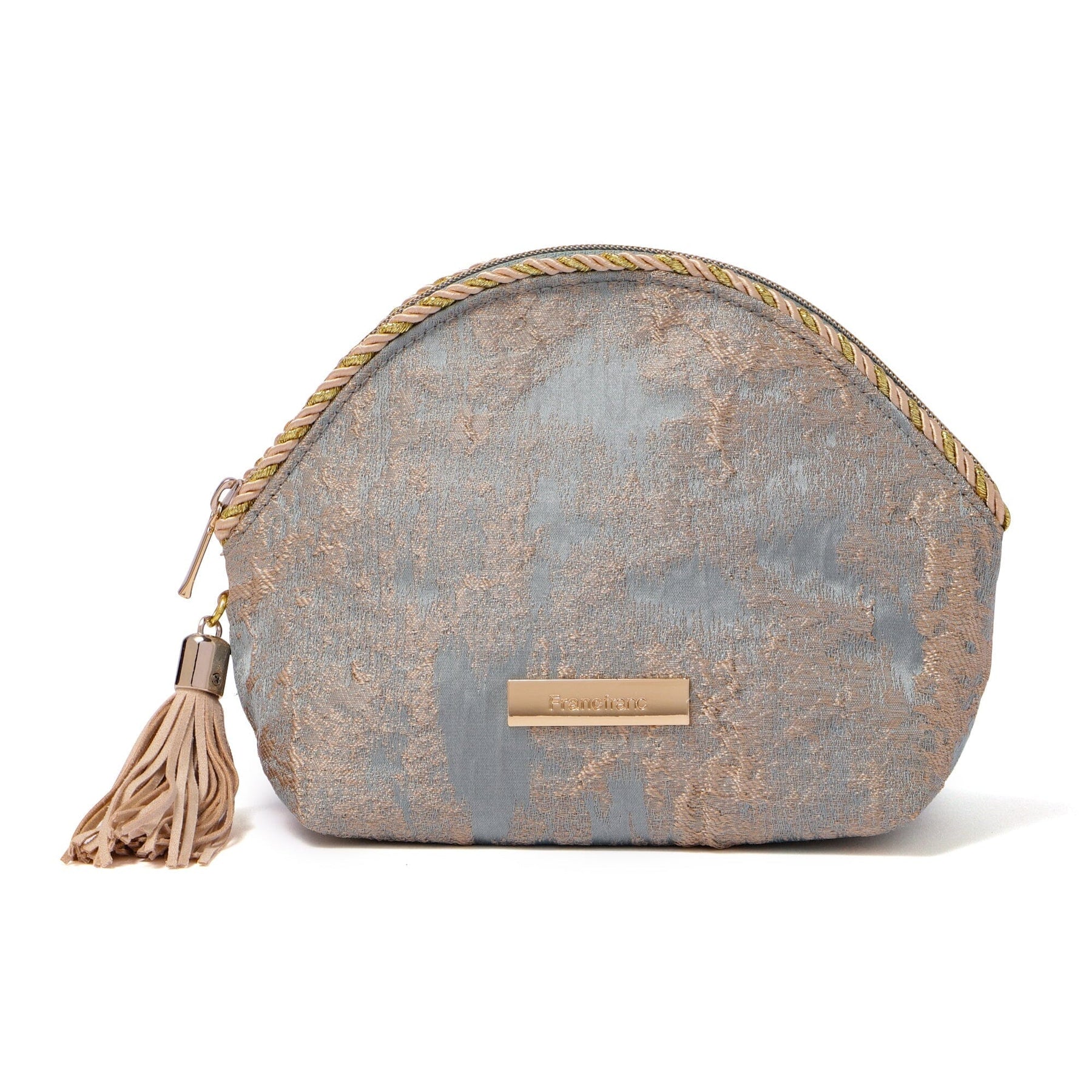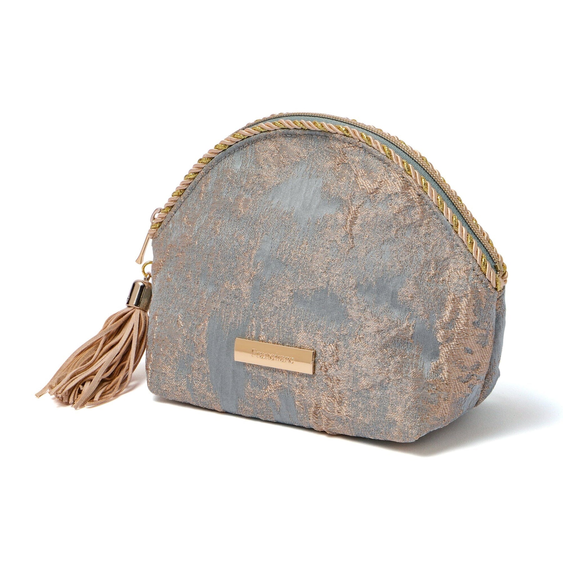 This is an elegantly designed cosmetic pouch with a beautiful gold texture like a painting.The details, such as the decorative rope and tassels, are luxuriously finished.