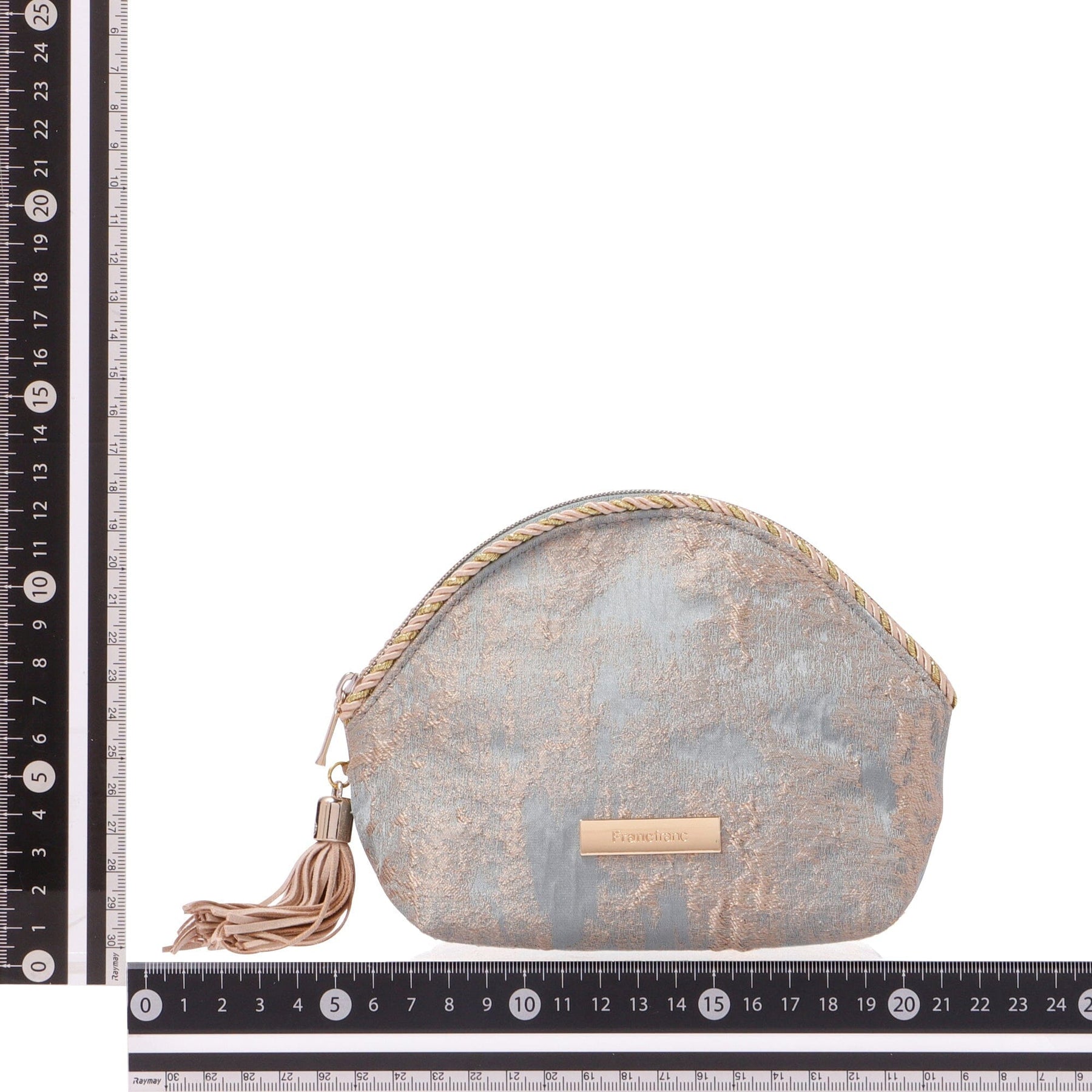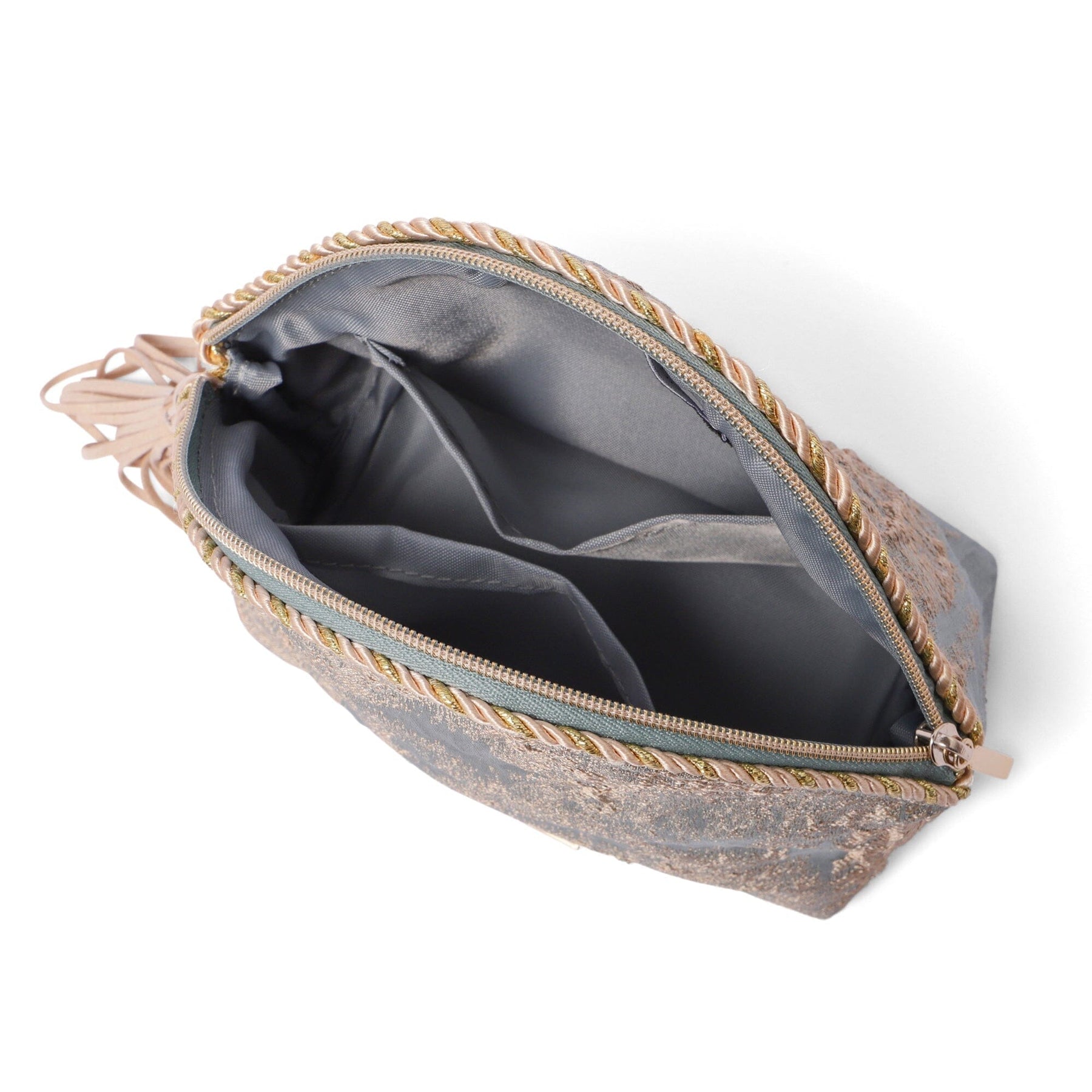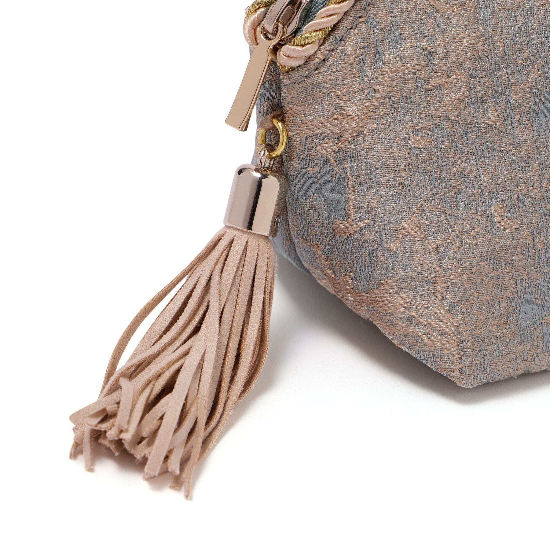 This is an elegantly designed cosmetic pouch with a beautiful gold texture like a painting.The details, such as the decorative rope and tassels, are luxuriously finished.