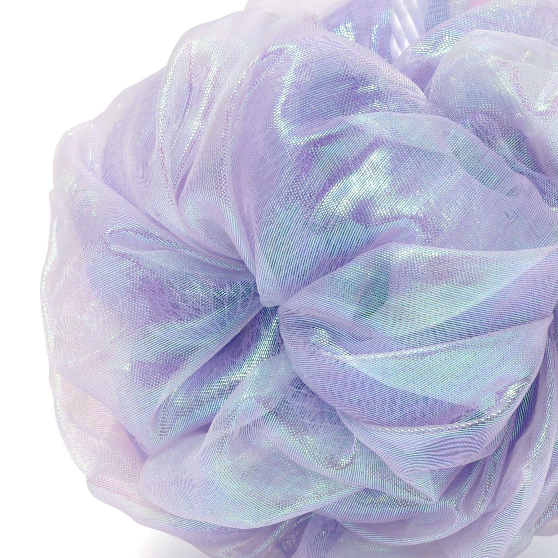 A bath sponge wrapped in glittering opal fabric.It creates good foam and makes bath time fun and glamorous.