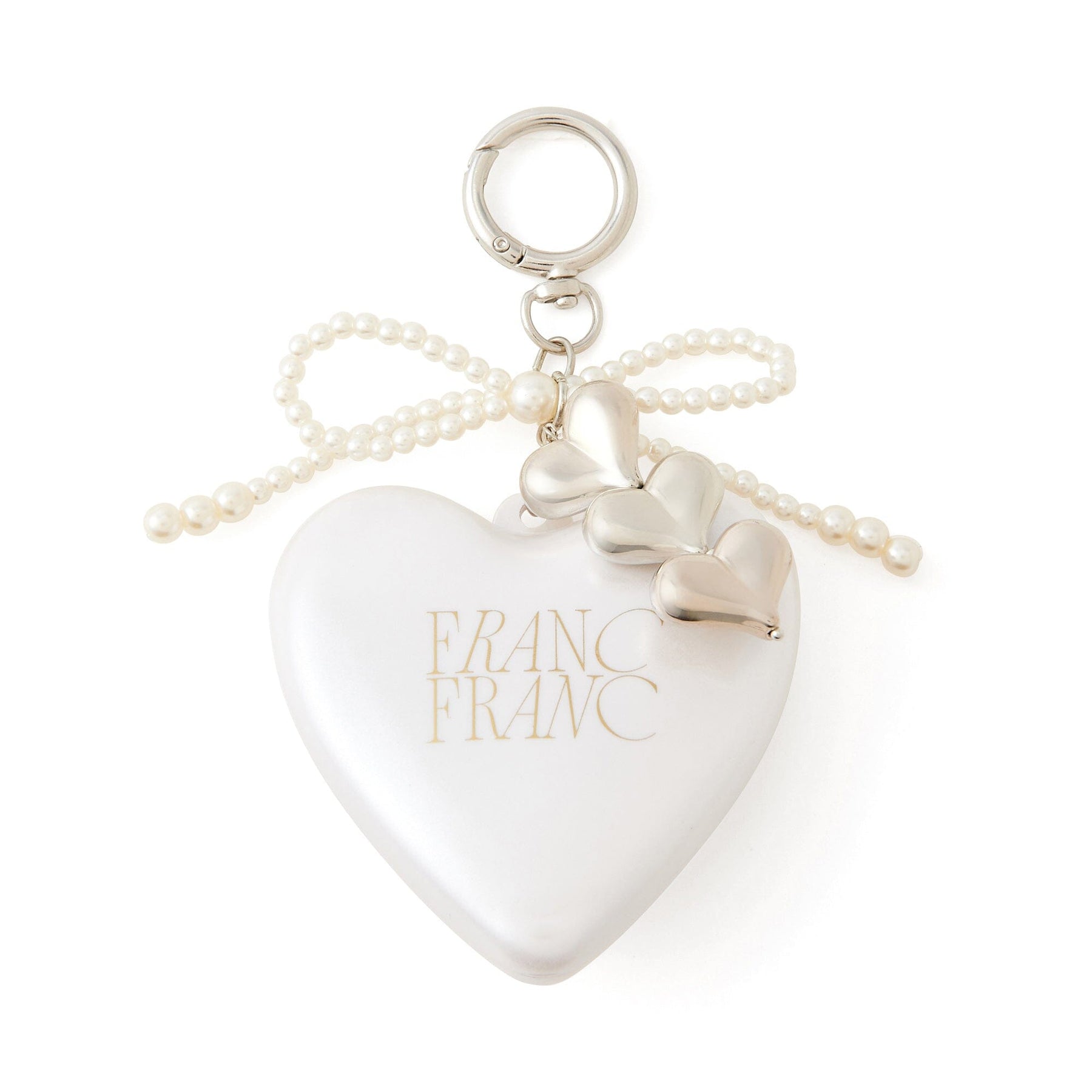 It comes with a carabiner, so you can attach it to your bag as a large heart charm. When opened, it reveals a mirror and brush, perfect for quick lip or hair touch-ups on the go.