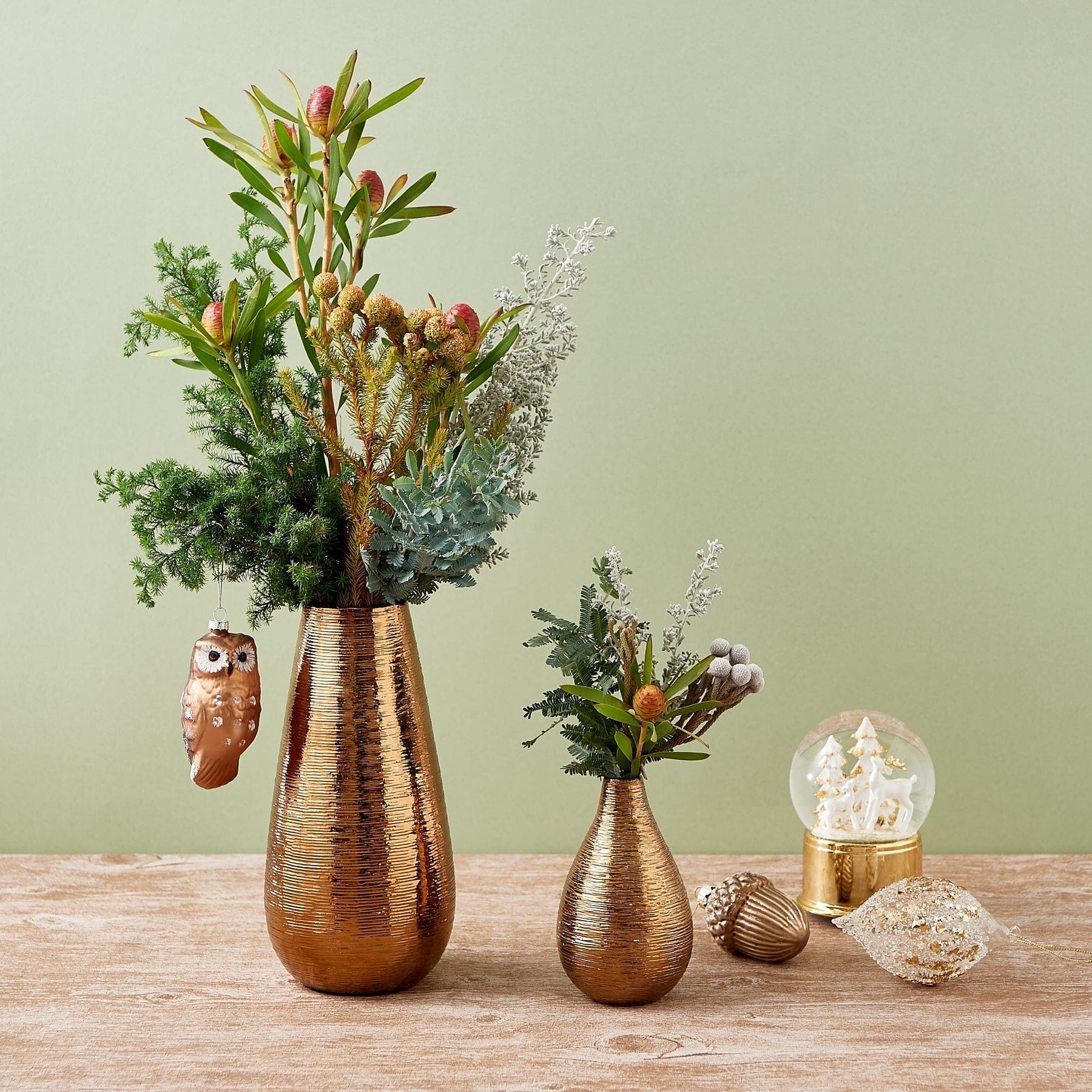 A chic vase in gold. Good for both western and Japanese flower arrangement. The narrow mouth is just perfect for a full bouquet of flowers.