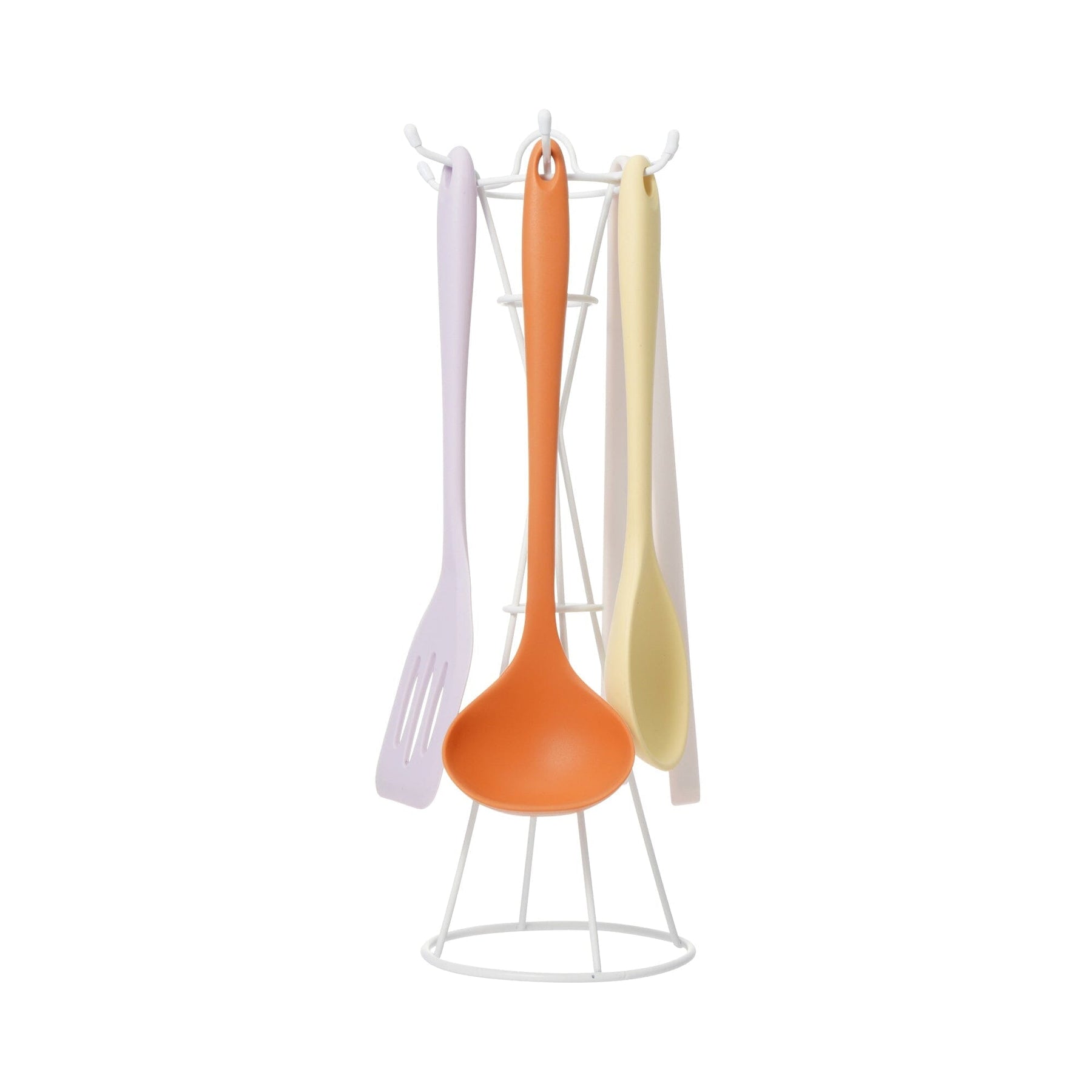 Material: Tool: Silicone rubber, Core material Ladle: Nylon, Turner: Stainless steel, Spoon: Steel, Tongs: Steel, Stand: Steel (Powder coating)