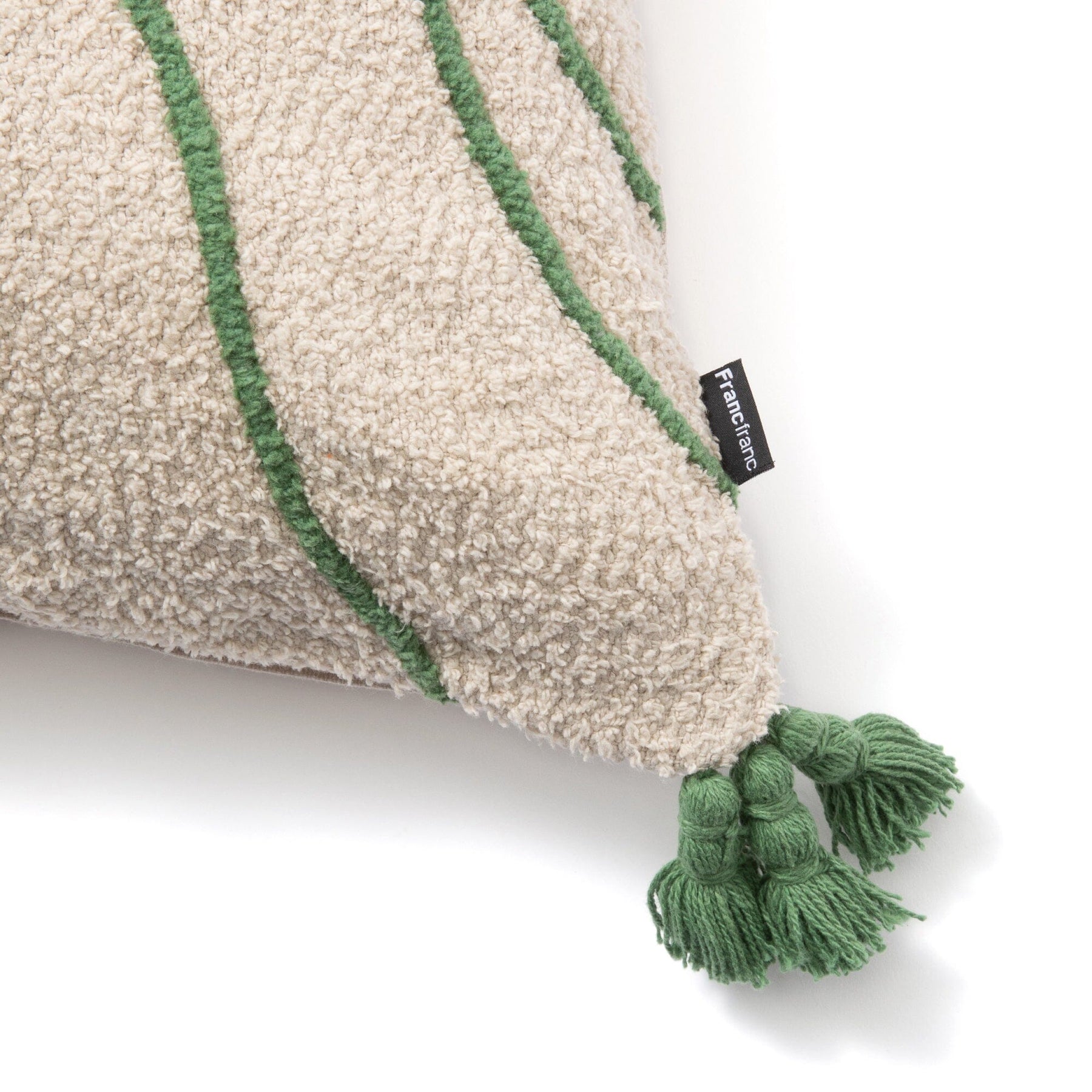 This cushion cover features textured fabric and three-dimensional embroidery with organic lines.Multiple tassels are adorned on the four corners, adding movement and a playful feel.