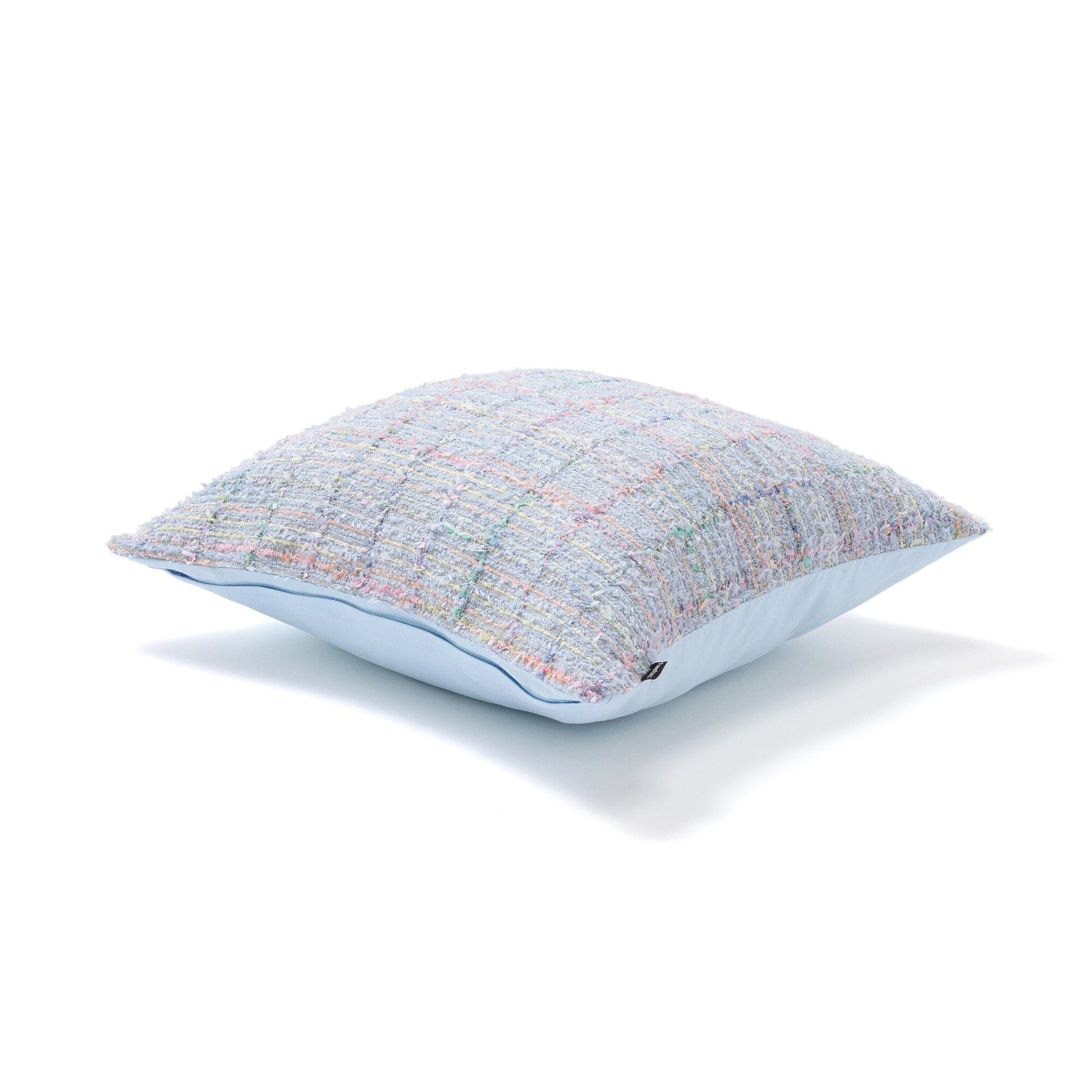 This trendy cushion cover features a refreshing blue base and a checkered pattern woven with colorful threads.