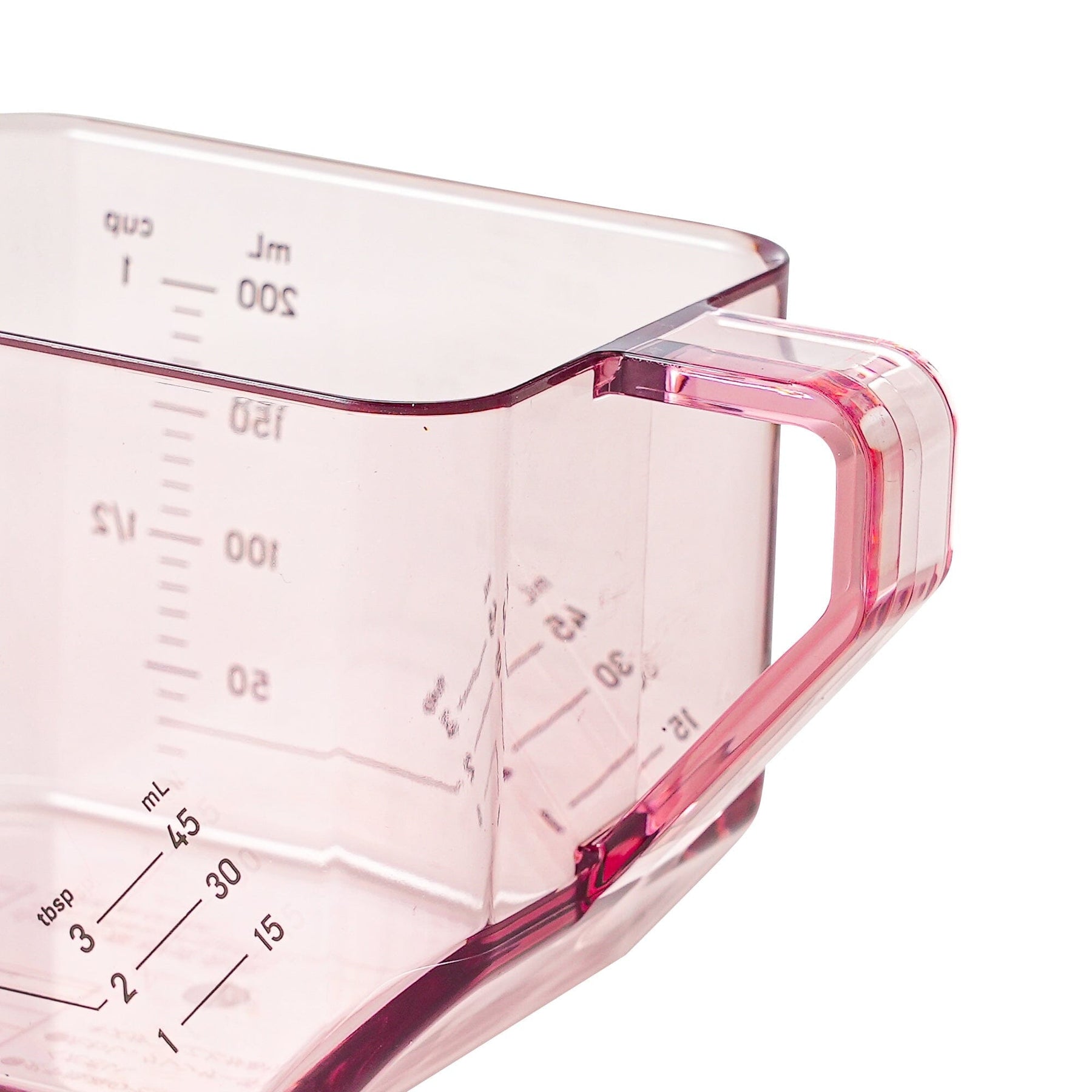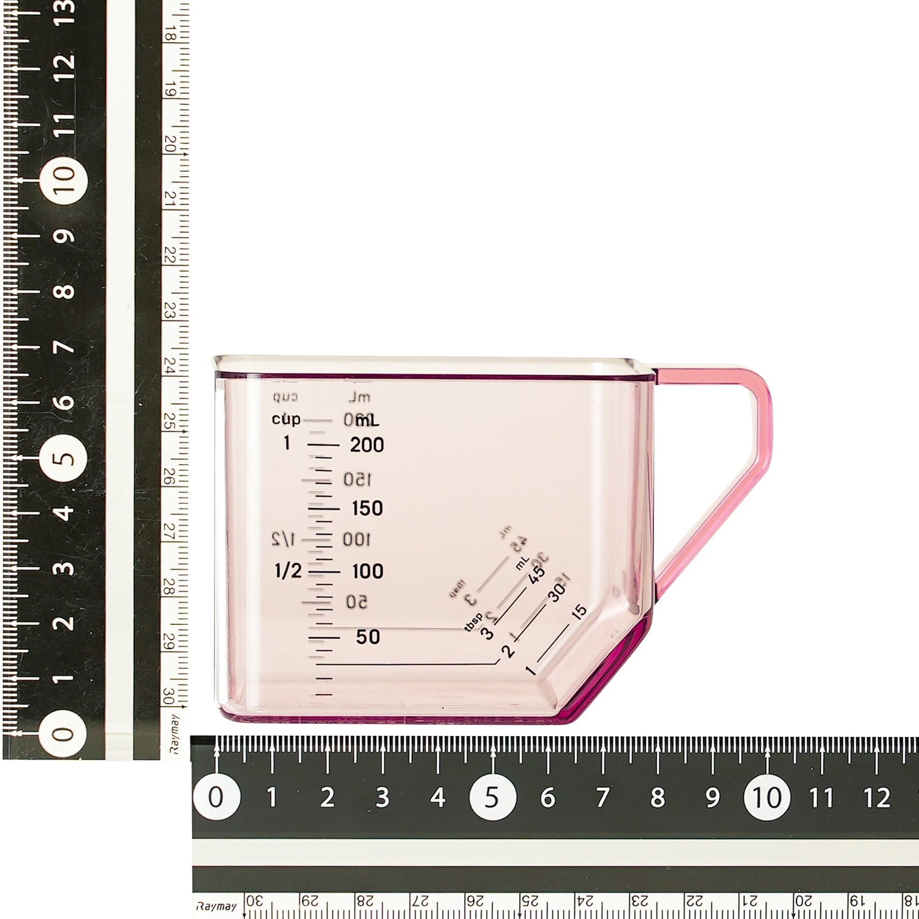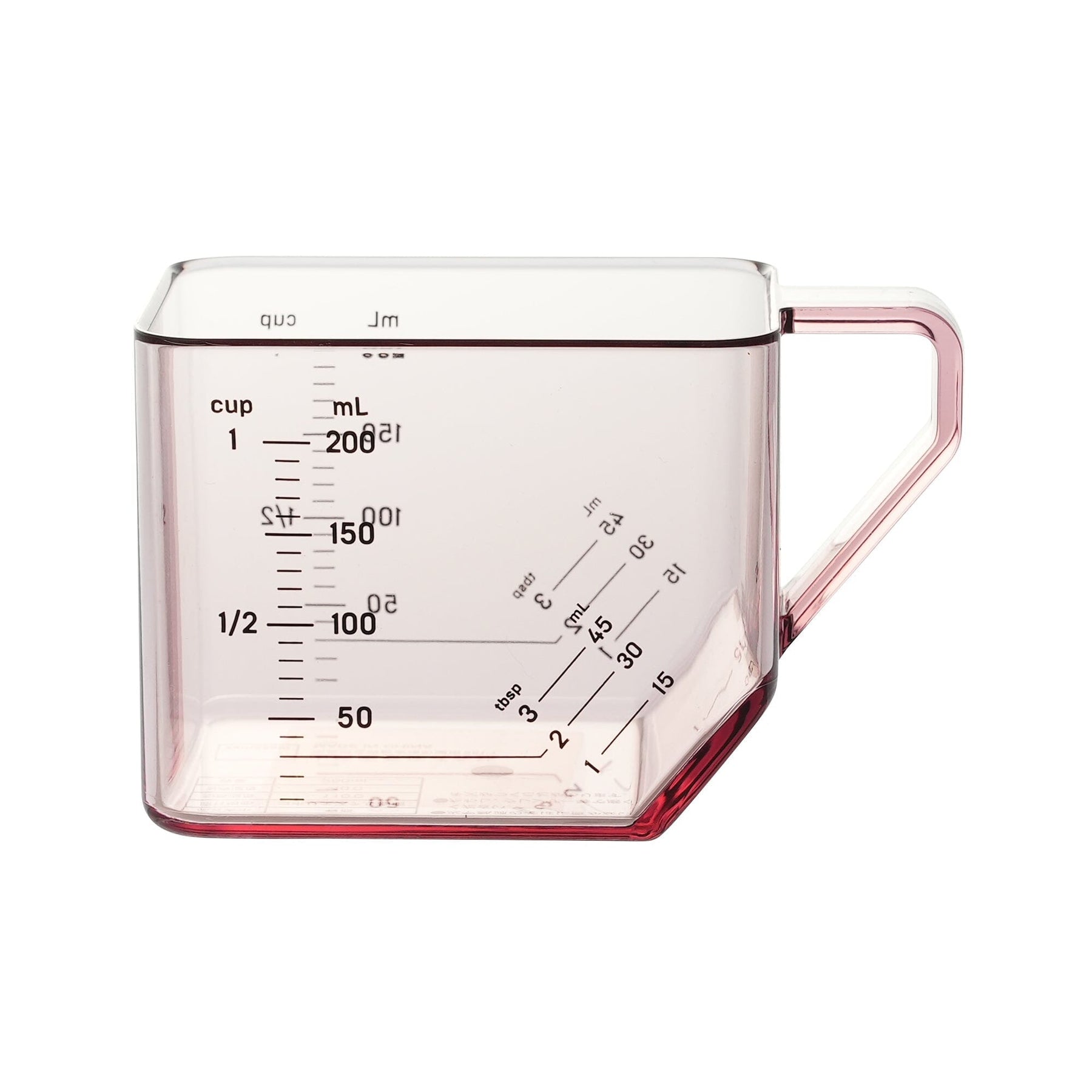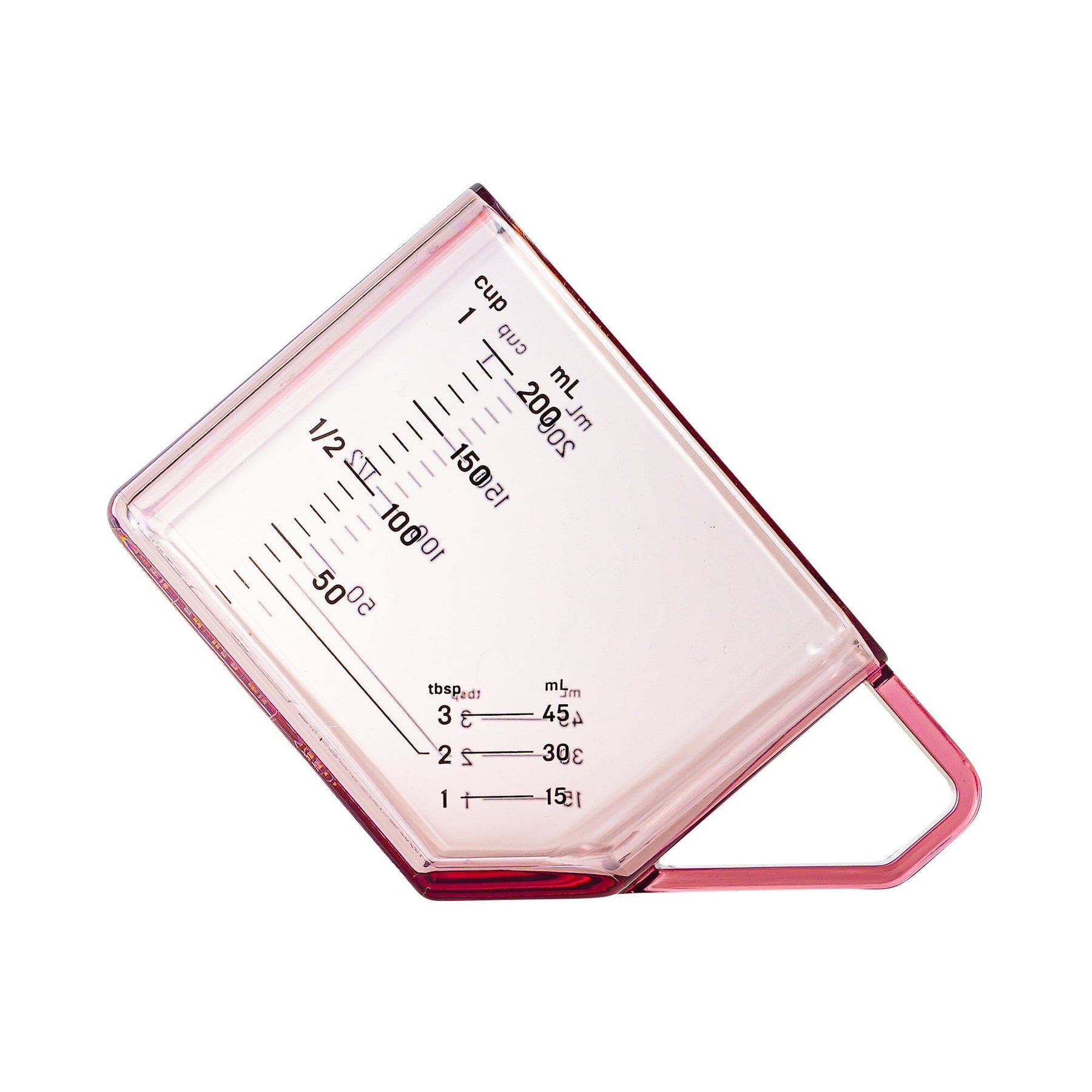 This 2-way measuring cup measures 1 cup when placed flat and 1 tablespoon when tilted.When placed flat, it measures up to 200ml in 10ml increments, 1/2 cup, and 1 cup.