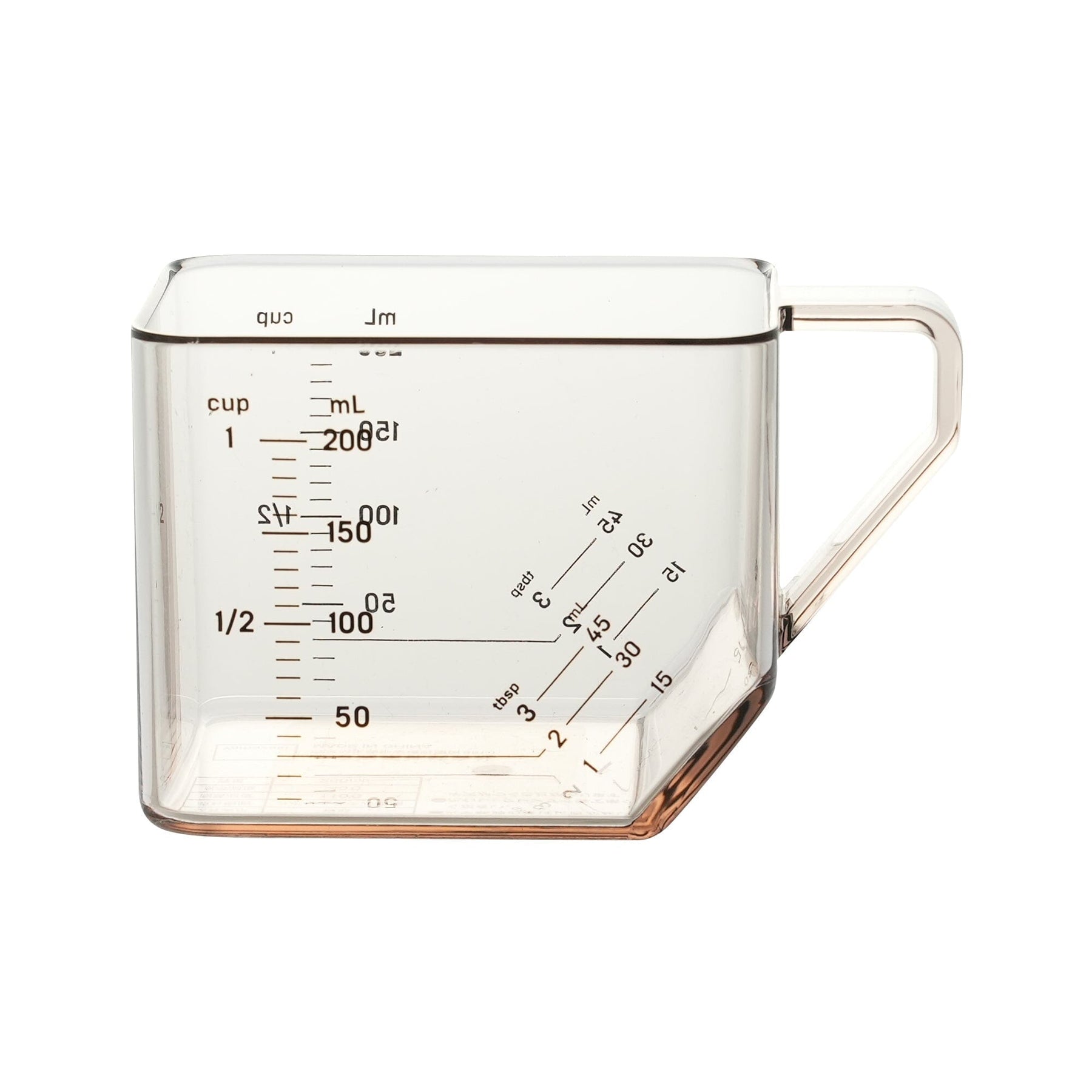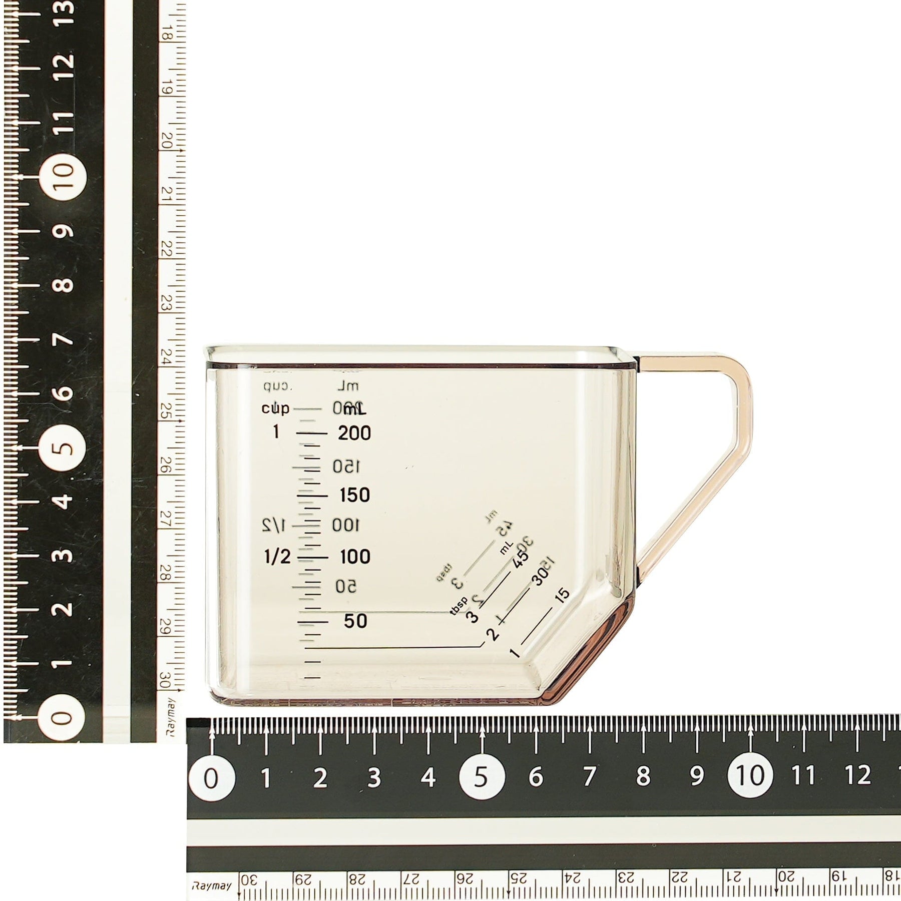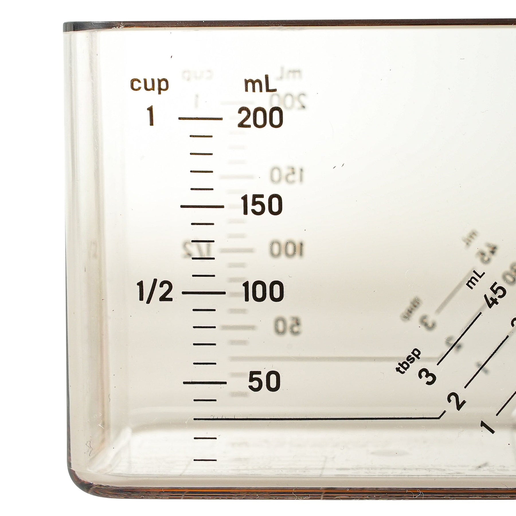 When placed flat, it measures up to 200ml in 10ml increments, 1/2 cup, and 1 cup.