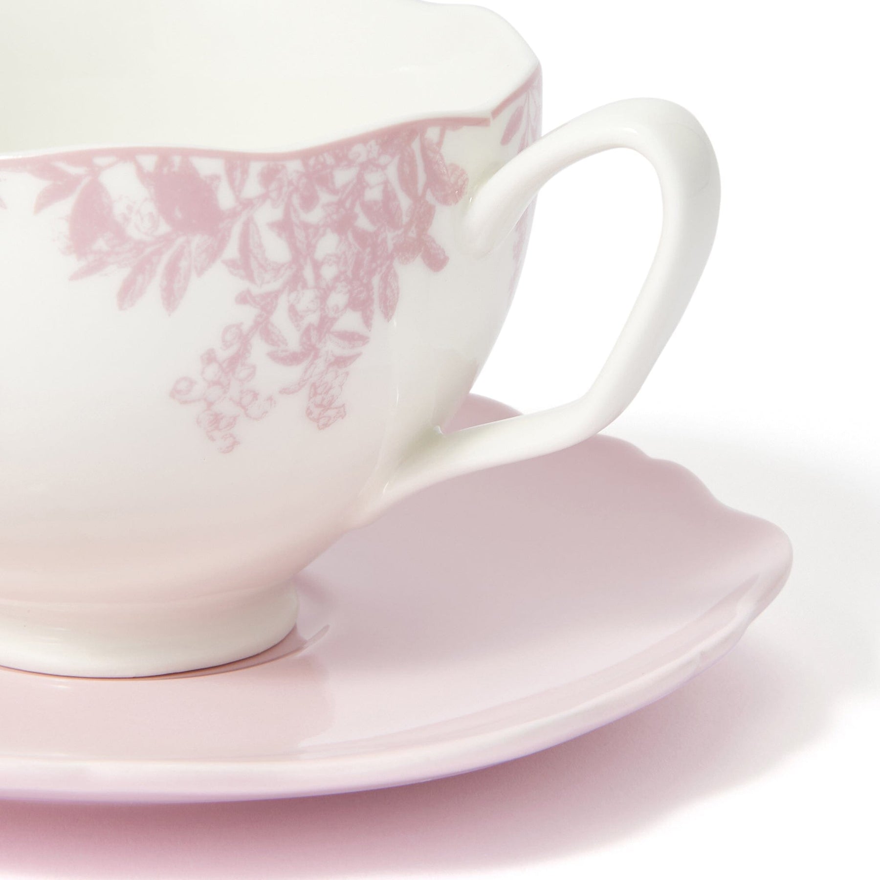 This cup and saucer features a classic and elegant Toile de Jouy pattern.