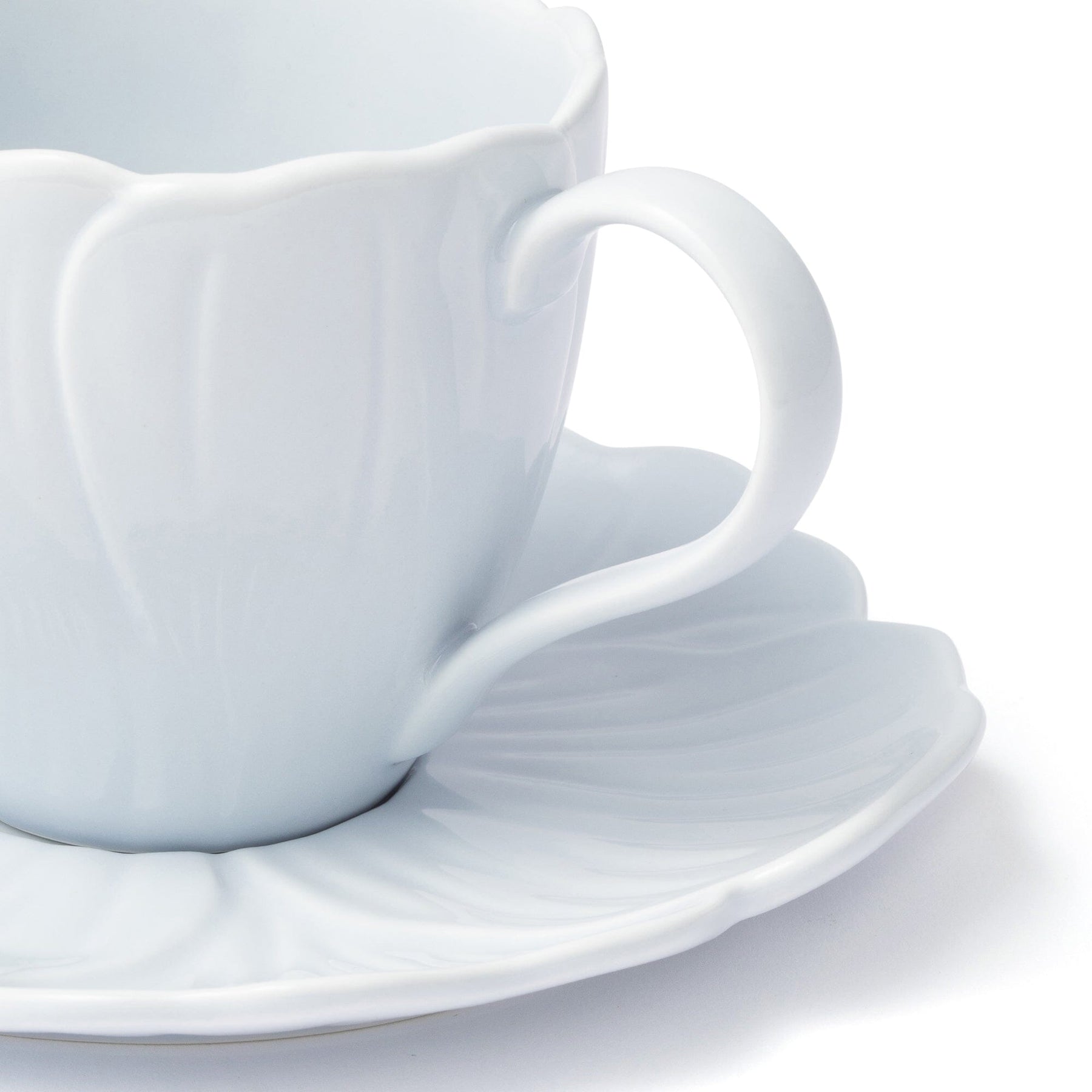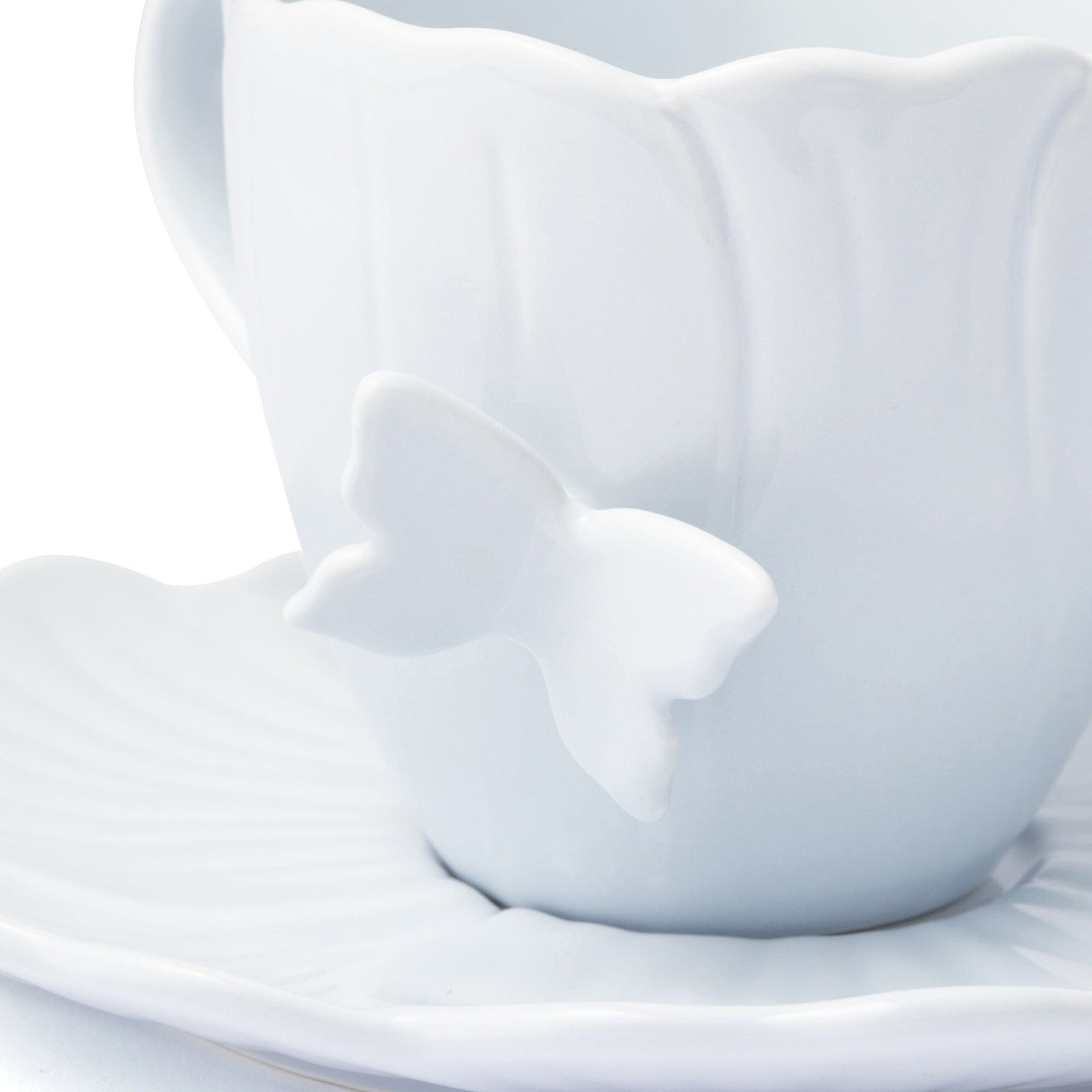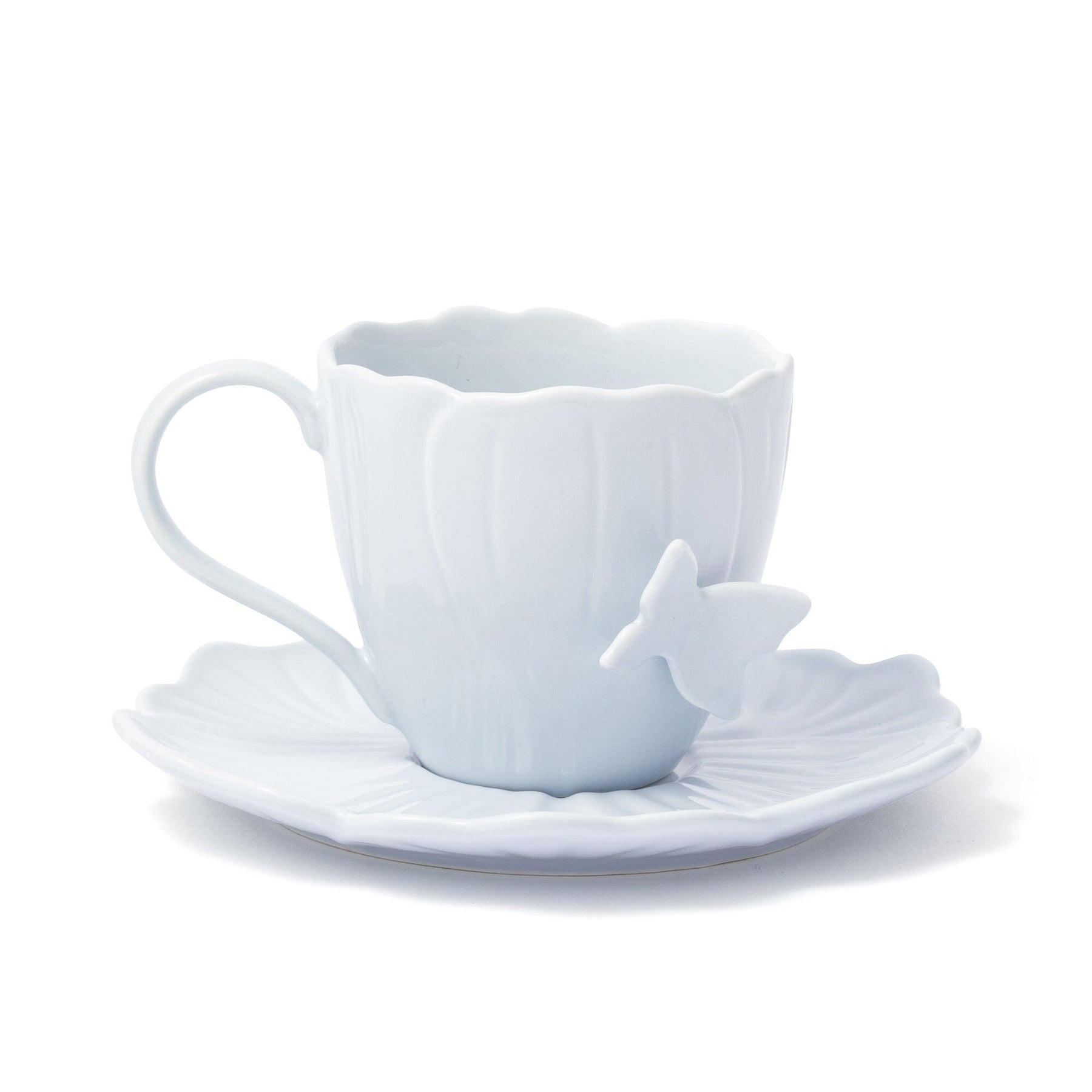 A lovely cup and saucer in the shape of a flower.A butterfly is a unique accent.
