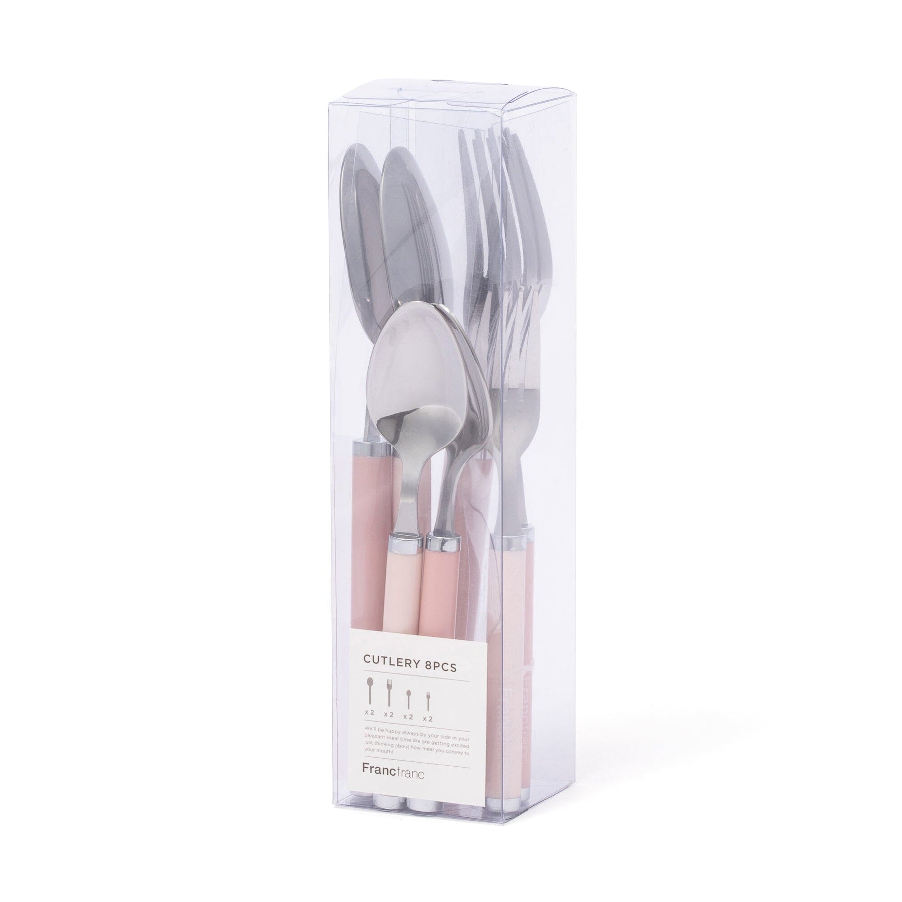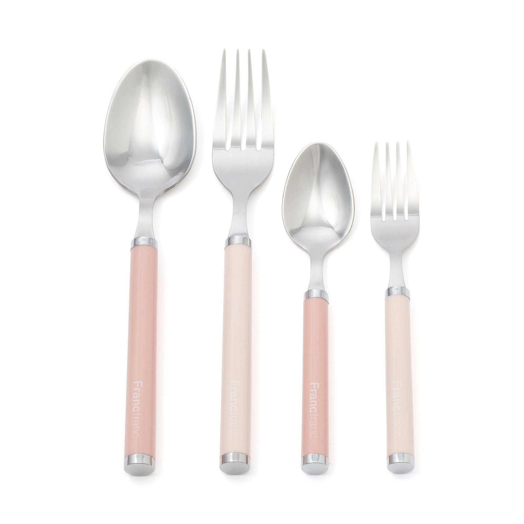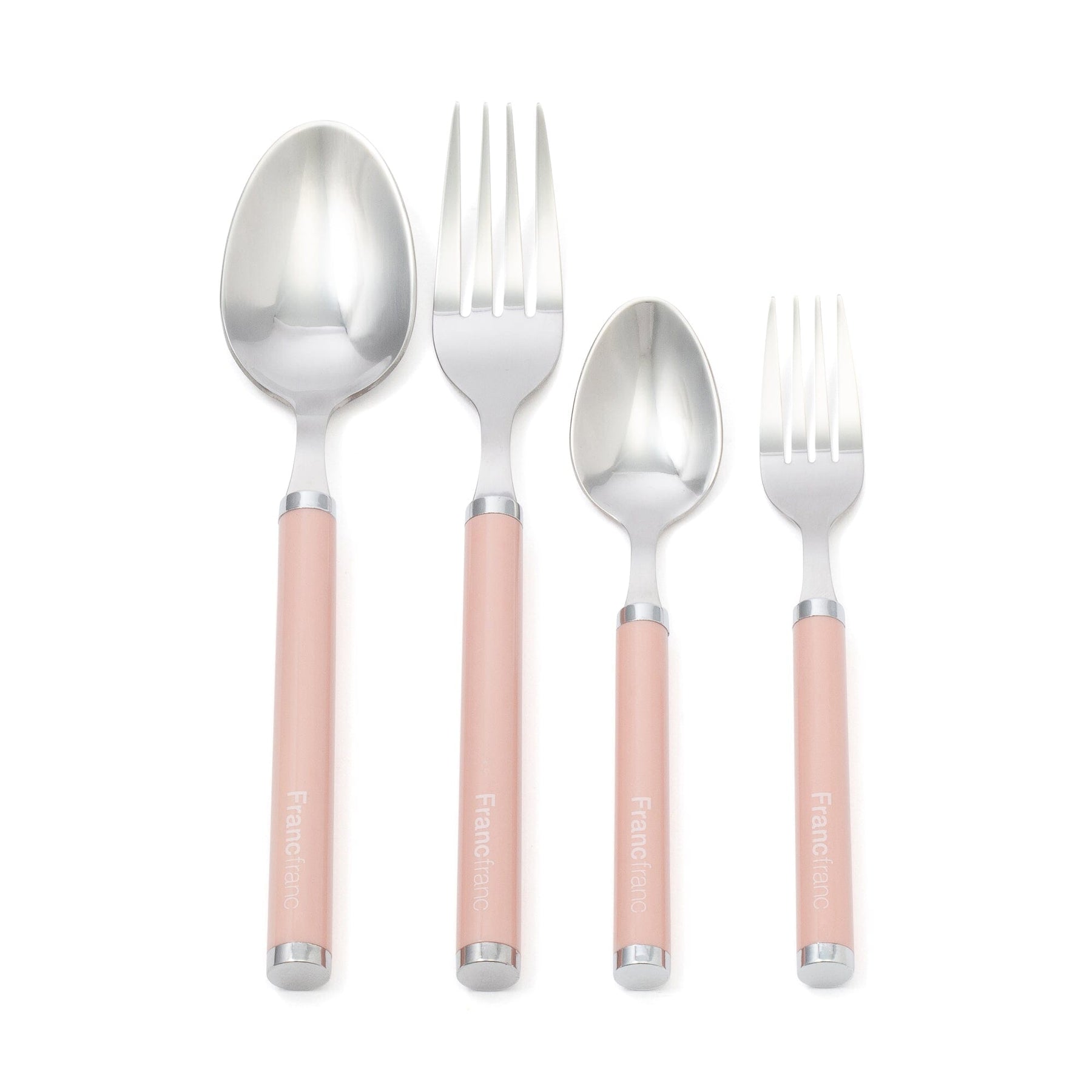 This cutlery set includes two dinner spoons, two forks, two teaspoons, and two cake forks.The Francfranc logo adds a nice accent.
