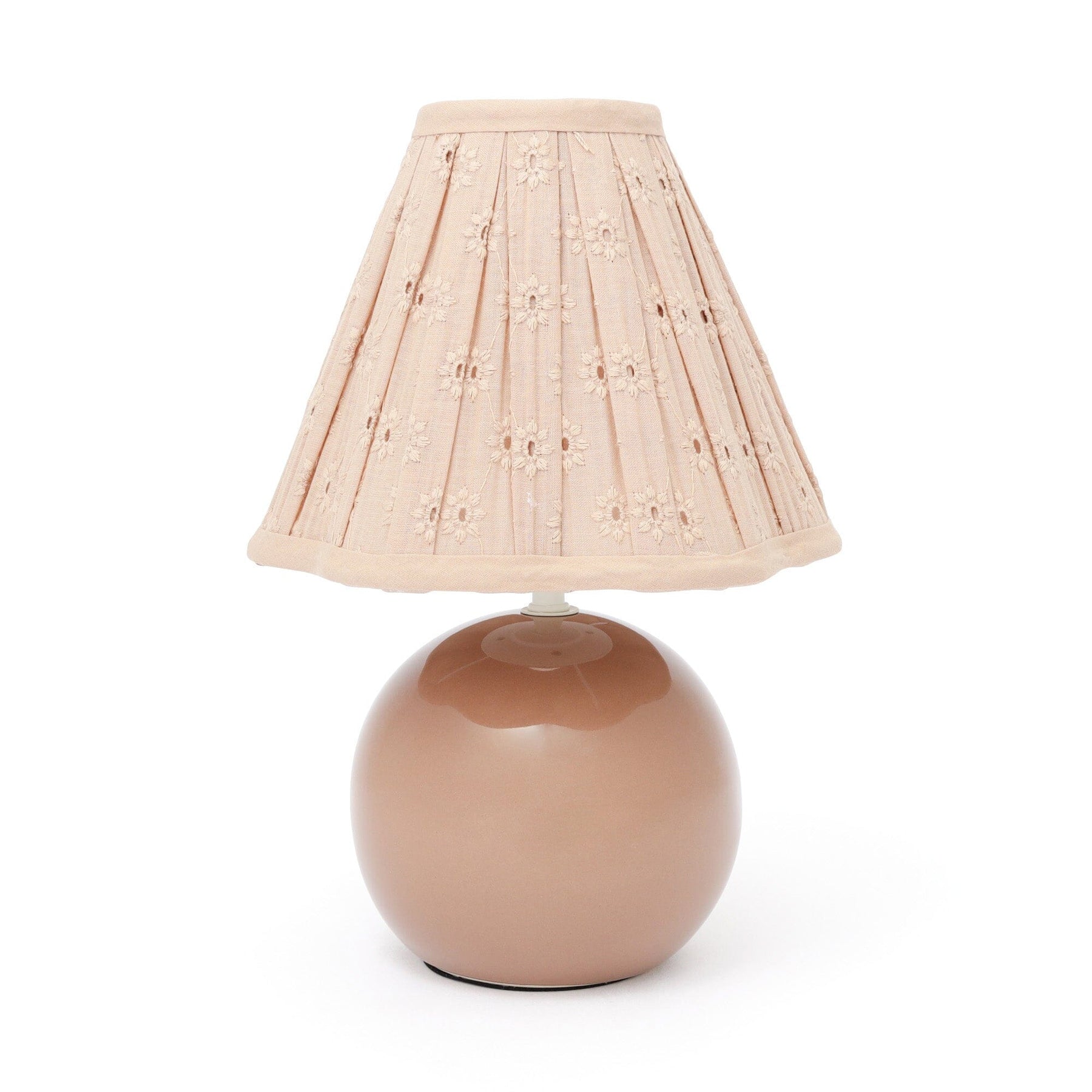 This lamp features a cute lace shade.It glows softly through the cloth shade.