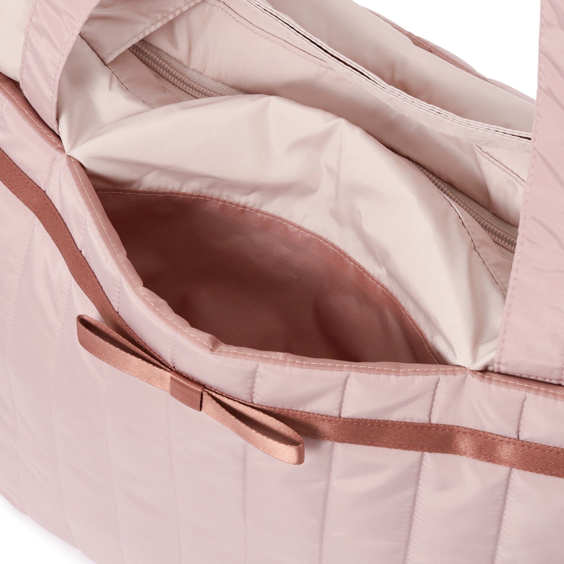 A sweet travel tote bag with a two-tone color scheme and ribbon accents.It can hold plenty of luggage and is ideal for short trips of one or two nights. It can be attached to the handle of a suitcase for easy transport.