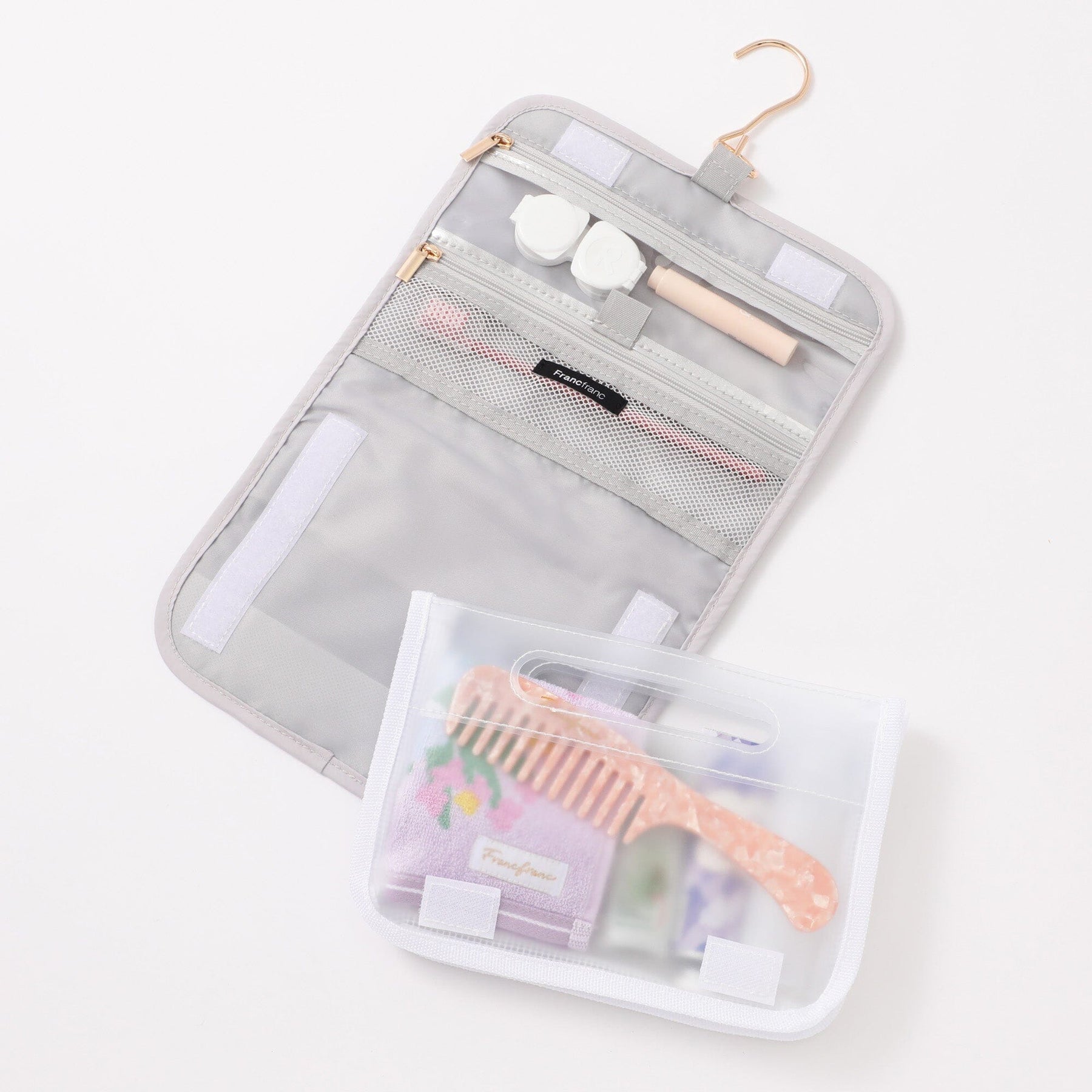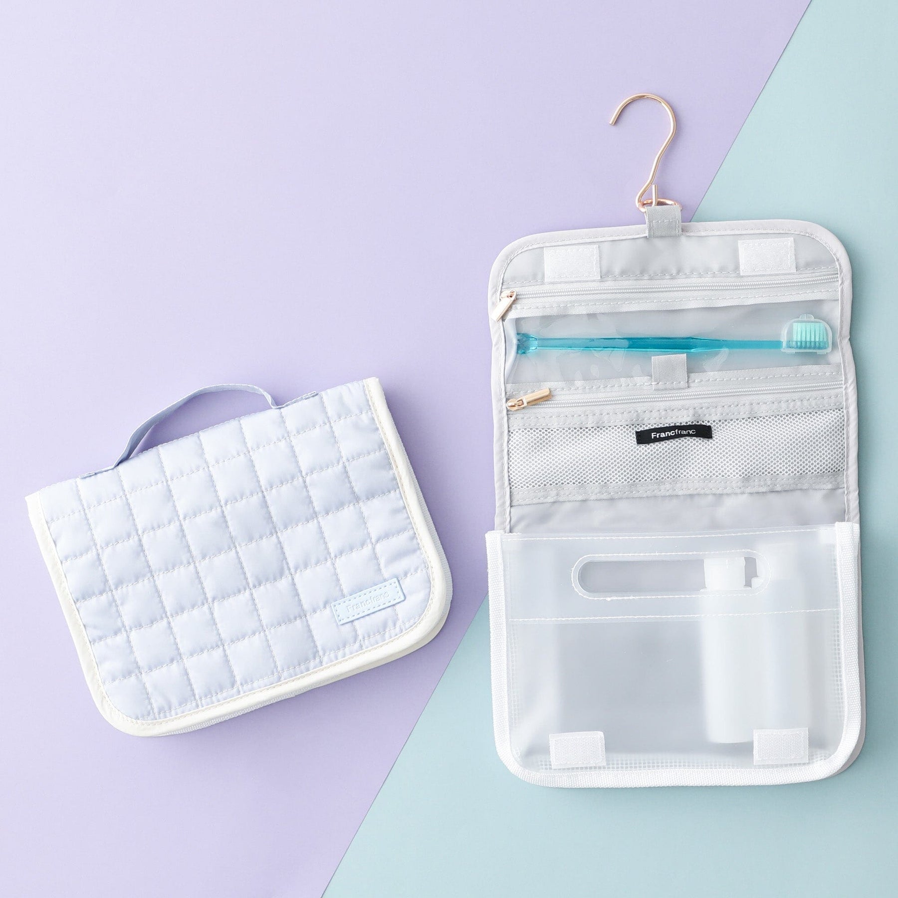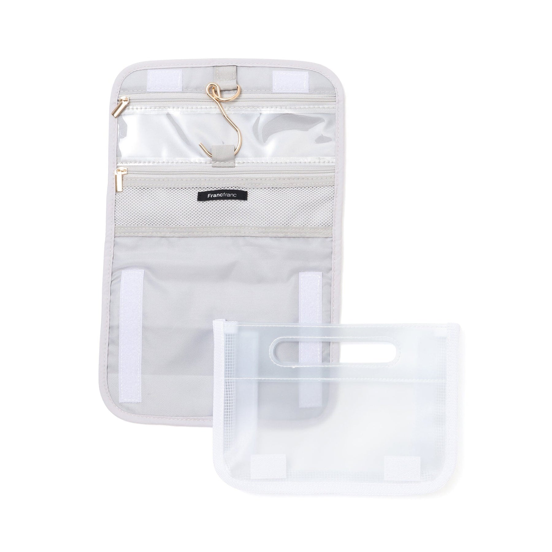 This convenient hanging pouch can be hung on a hanger hook in the bathroom when traveling.The mesh zipper pocket is perfect for storing small items such as cosmetics, toothbrushes, and hairpins.