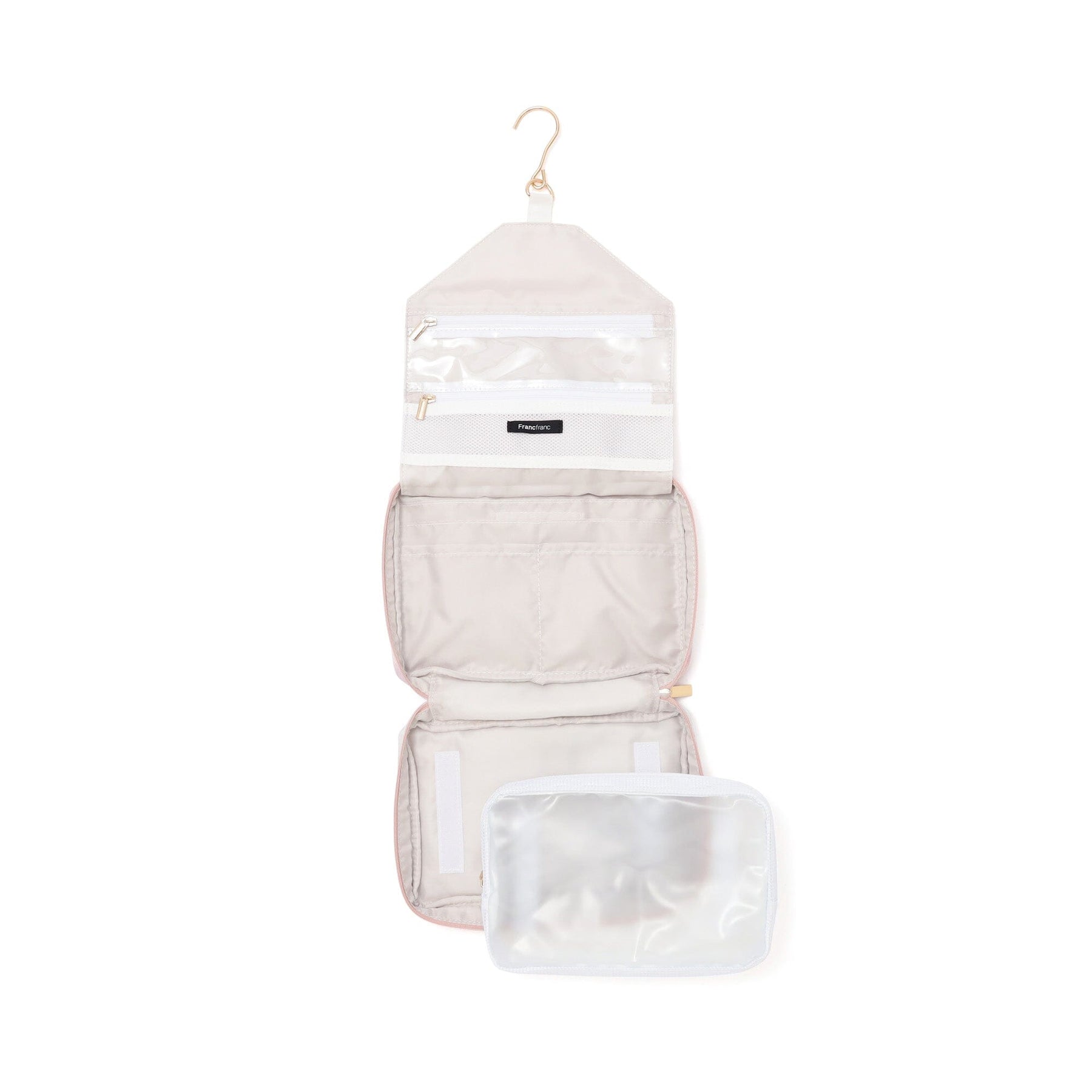 This convenient hanging pouch can be hung on a hanger hook in the bathroom or other areas while traveling.