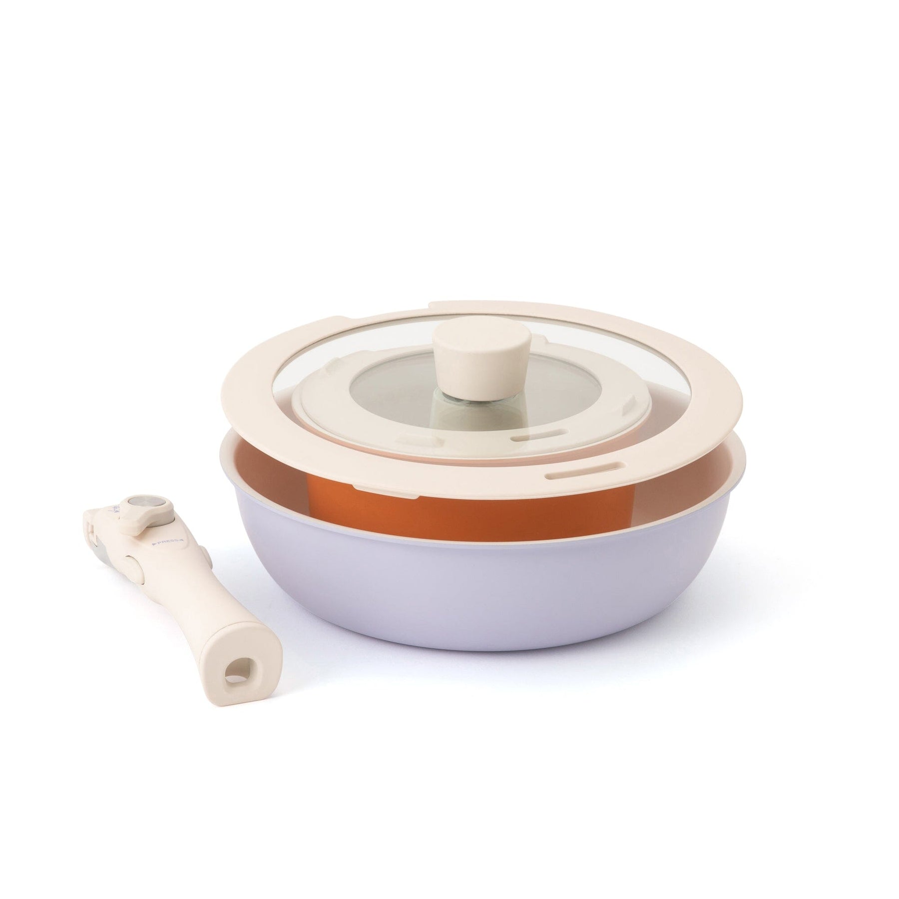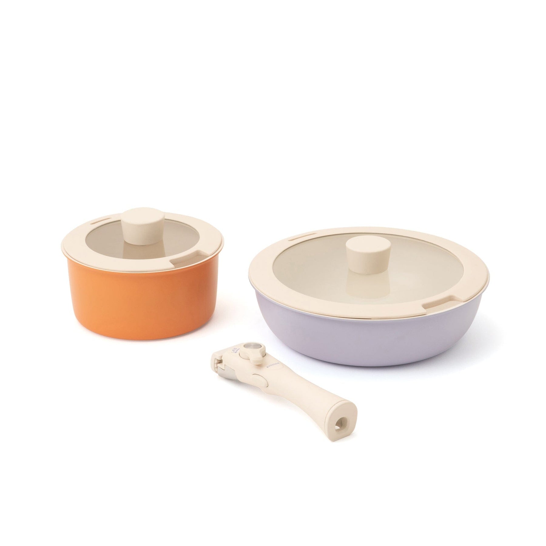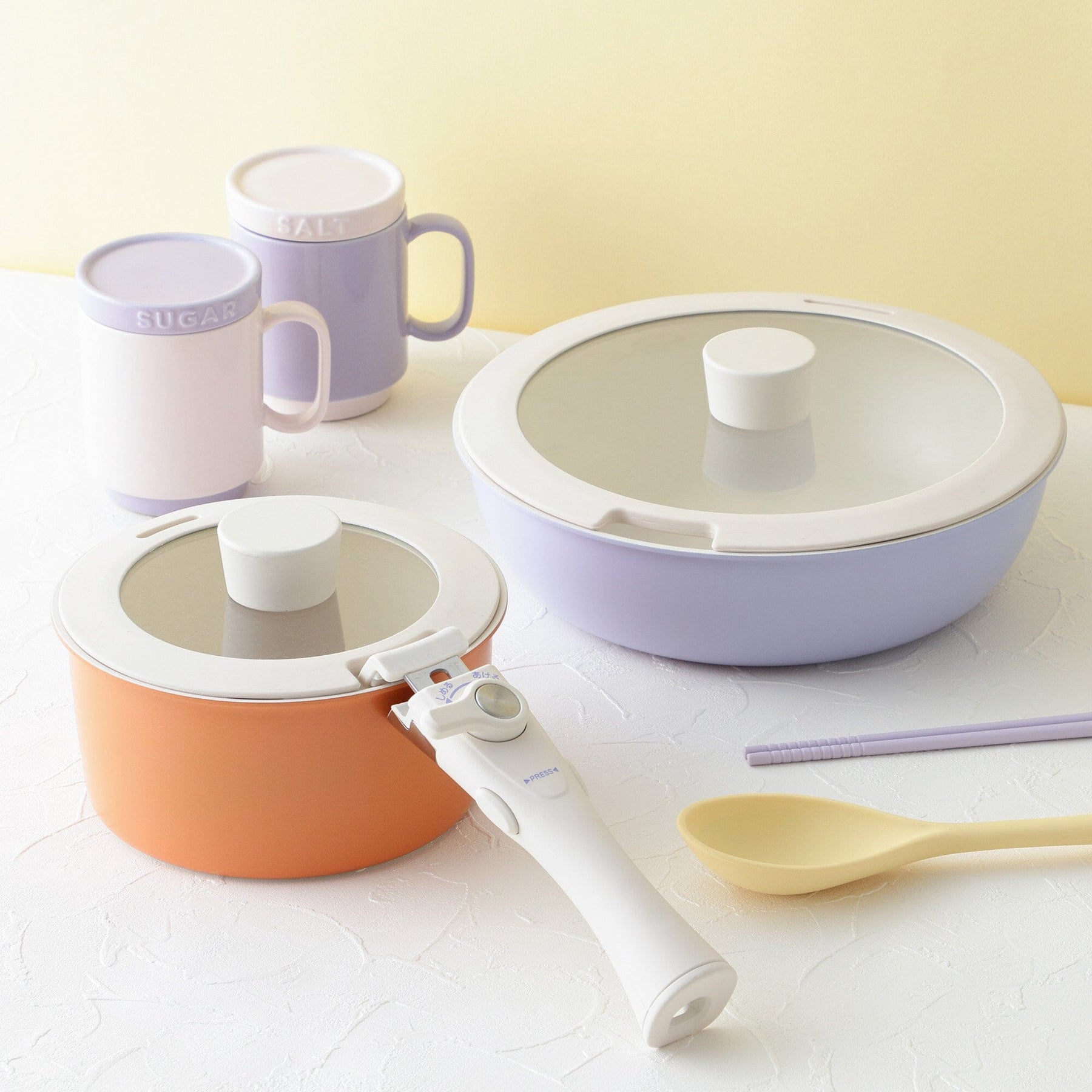 A set of pots and pans with detachable handles that can be stacked and stored even in limited space.Available in two types: a cute pink with a gradation and a happy multi-color. Makes cooking every day more fun.