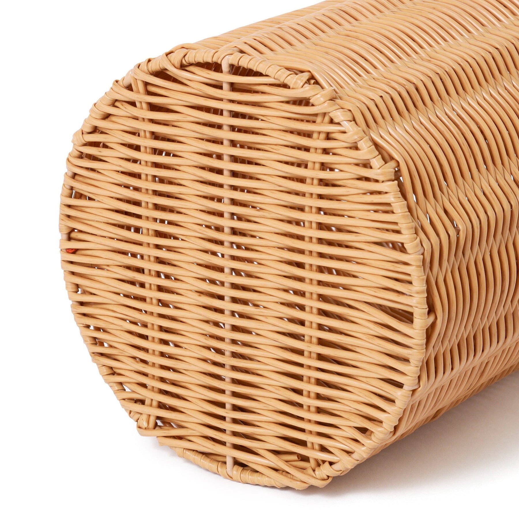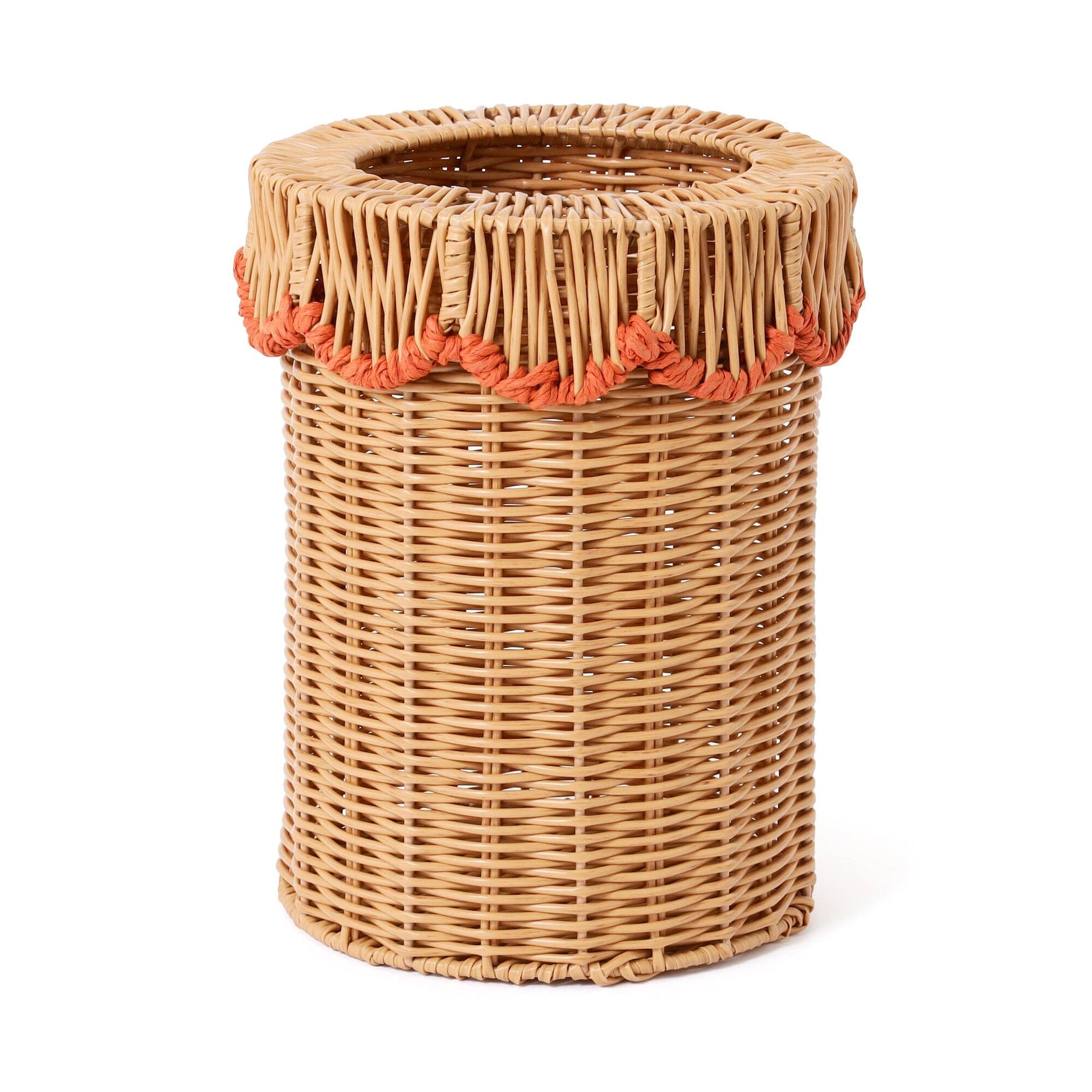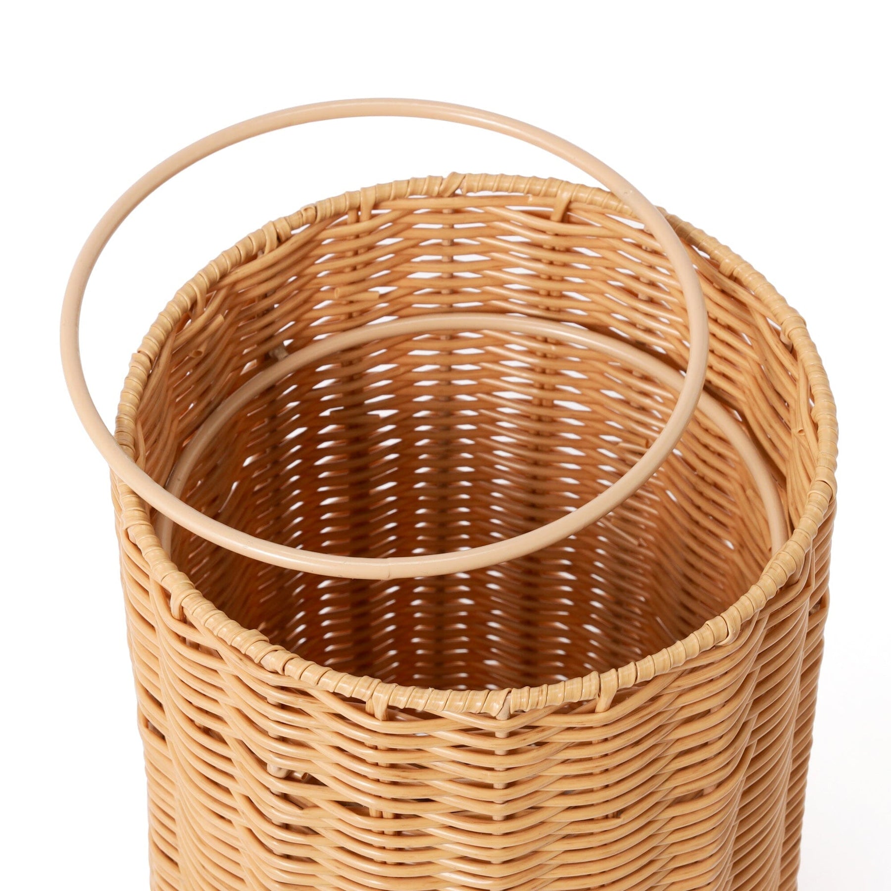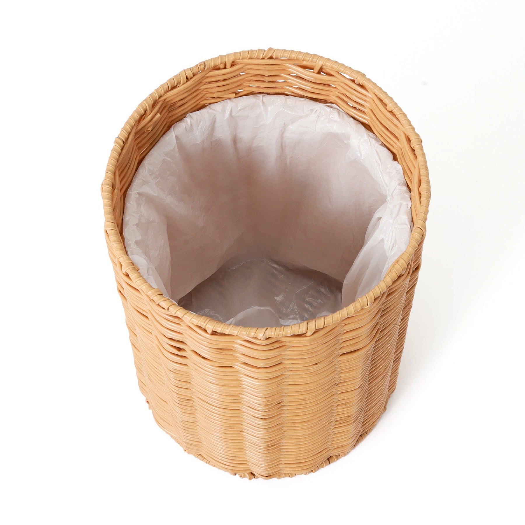 This is a rattan-style trash can made of plastic.