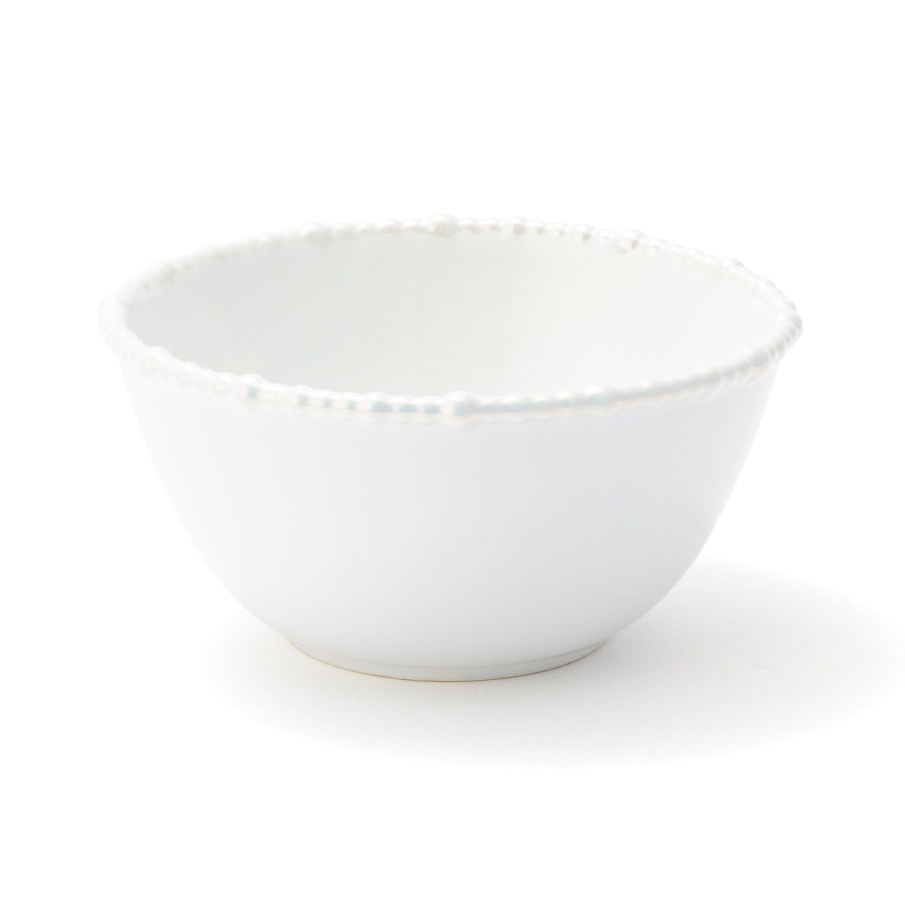A bowl decorated with randomly sized pearls on the rim.