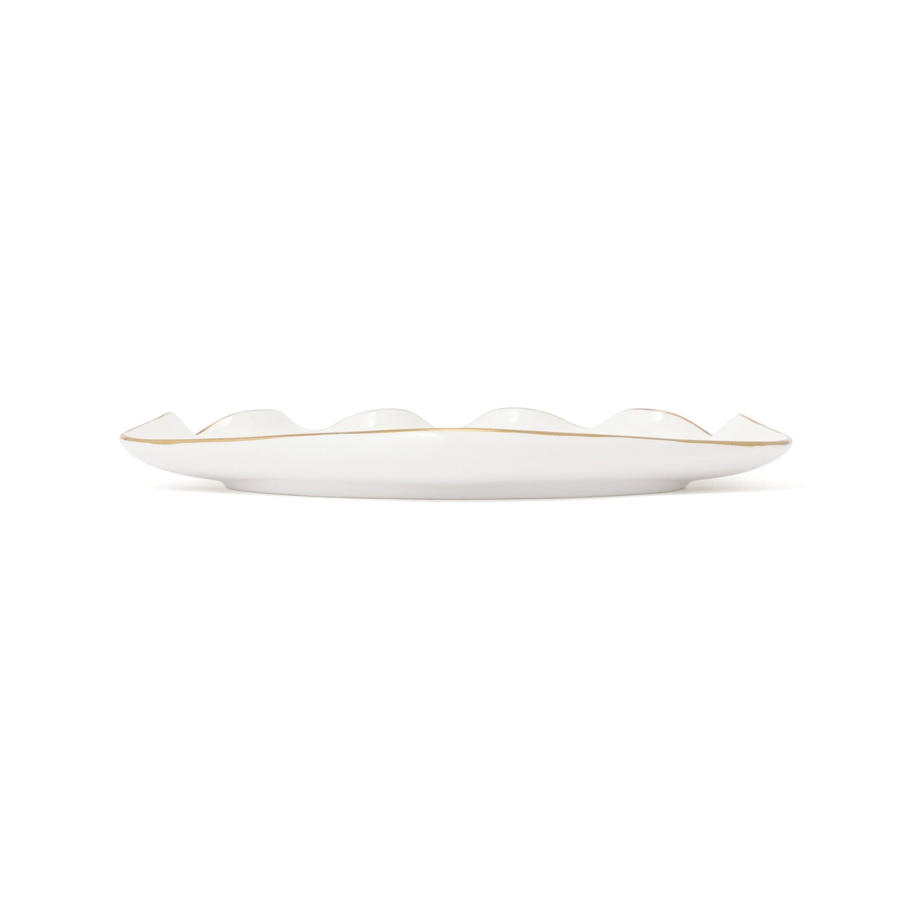 This plate features a shell motif.The intentionally uneven design creates a realistic shell shape. The gold accents on the rim add a touch of elegance.