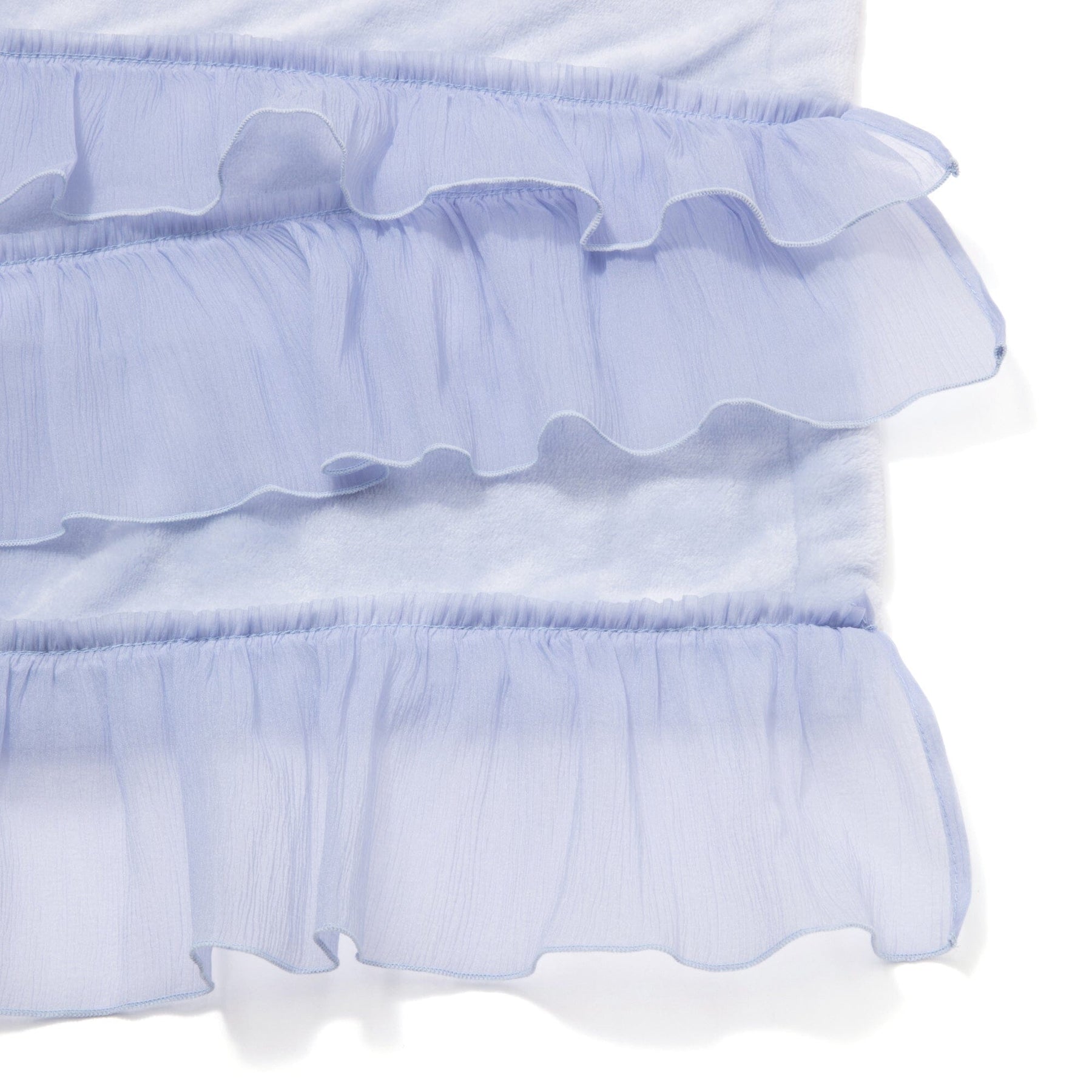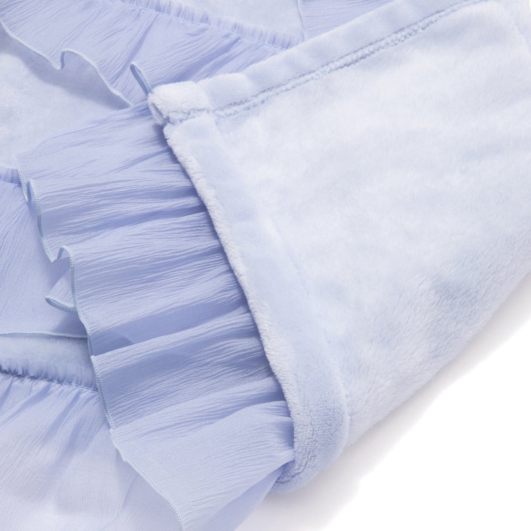 This throw (lap blanket) is made of smooth microfiber fabric with soft organza ruffles.The marshmallow-like texture is addictive once you touch it.
