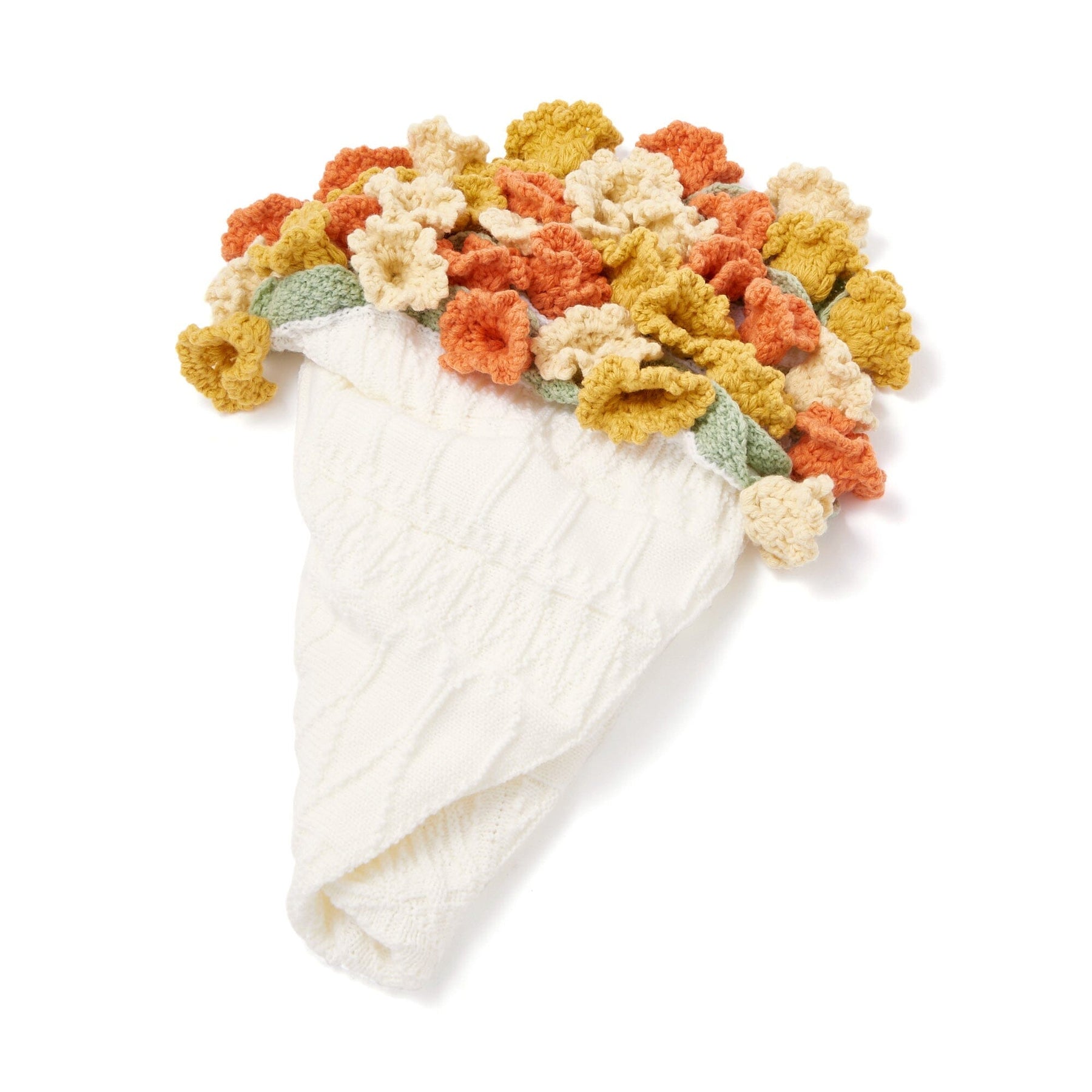 This crocheted throw (lap blanket) resembles a bouquet when rolled up.