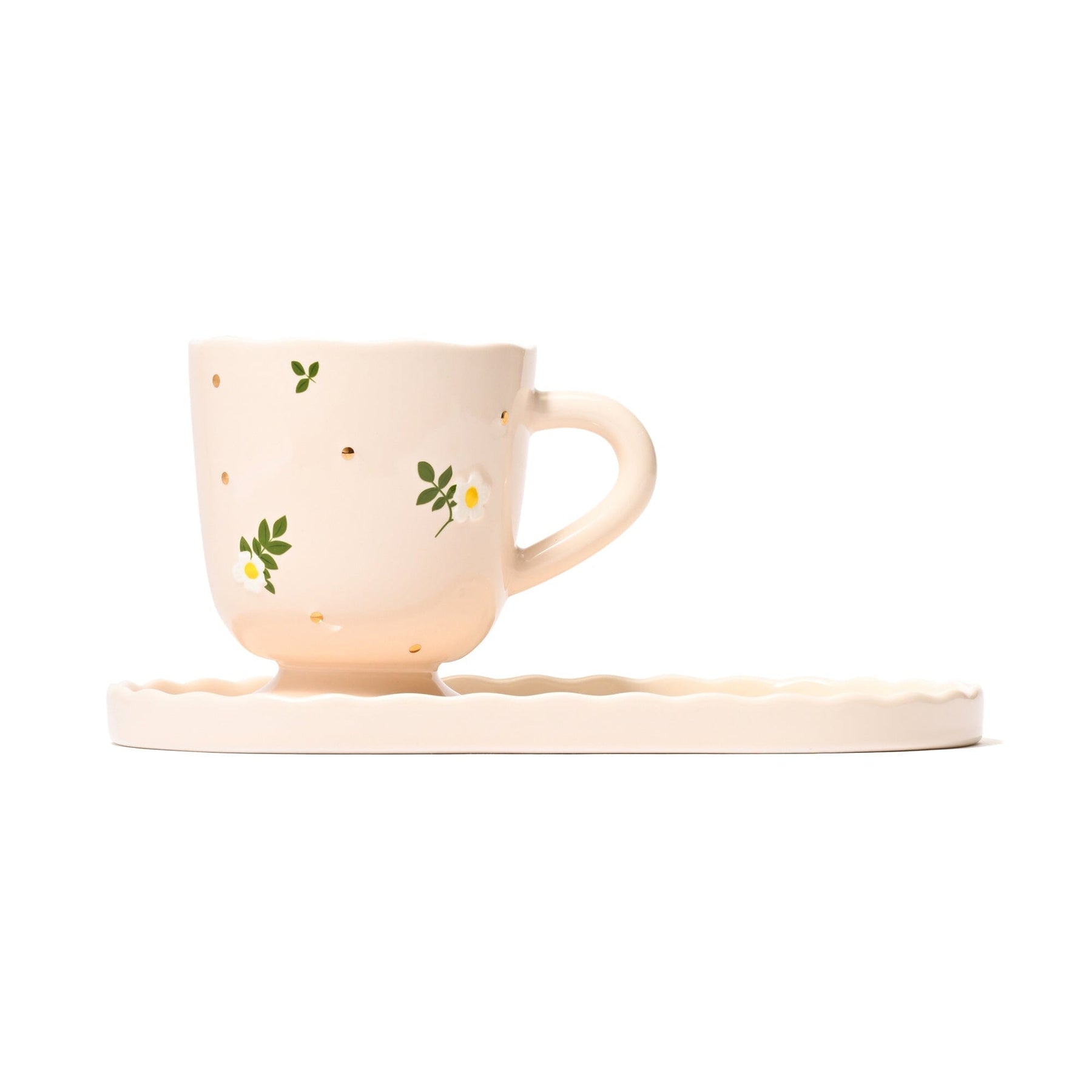 It includes a stemmed cup and a large plate. Simply place your cup and sweets on the plate to enjoy a casual tea time.