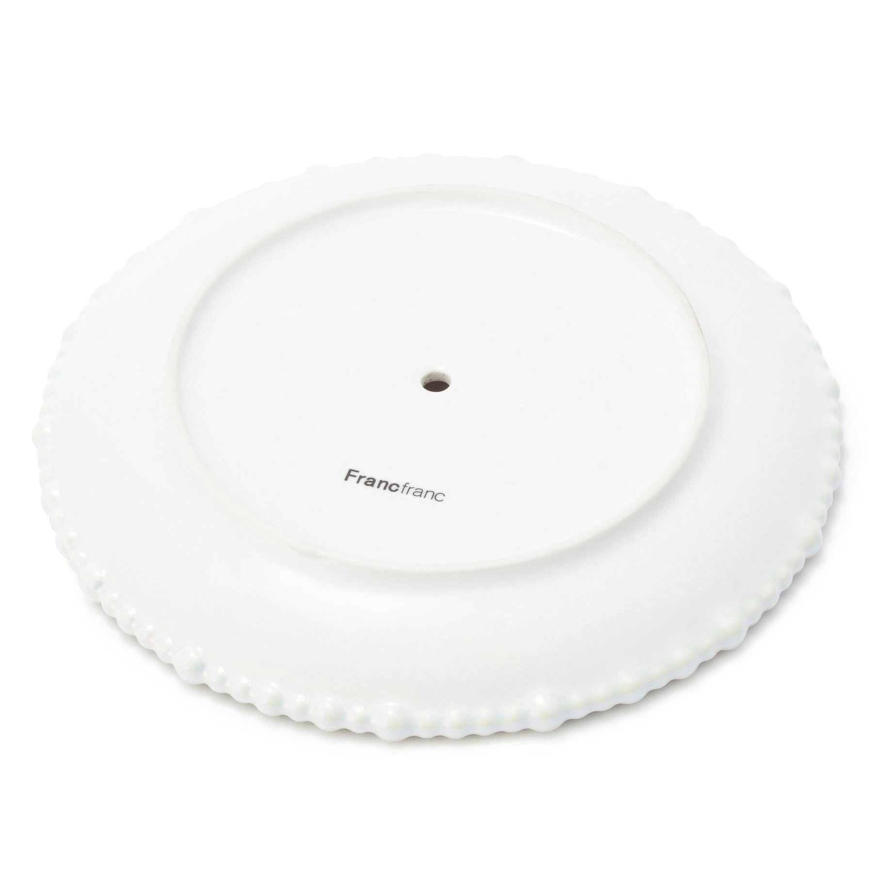 A three-tiered cake stand decorated with randomly sized pearls on the rim.