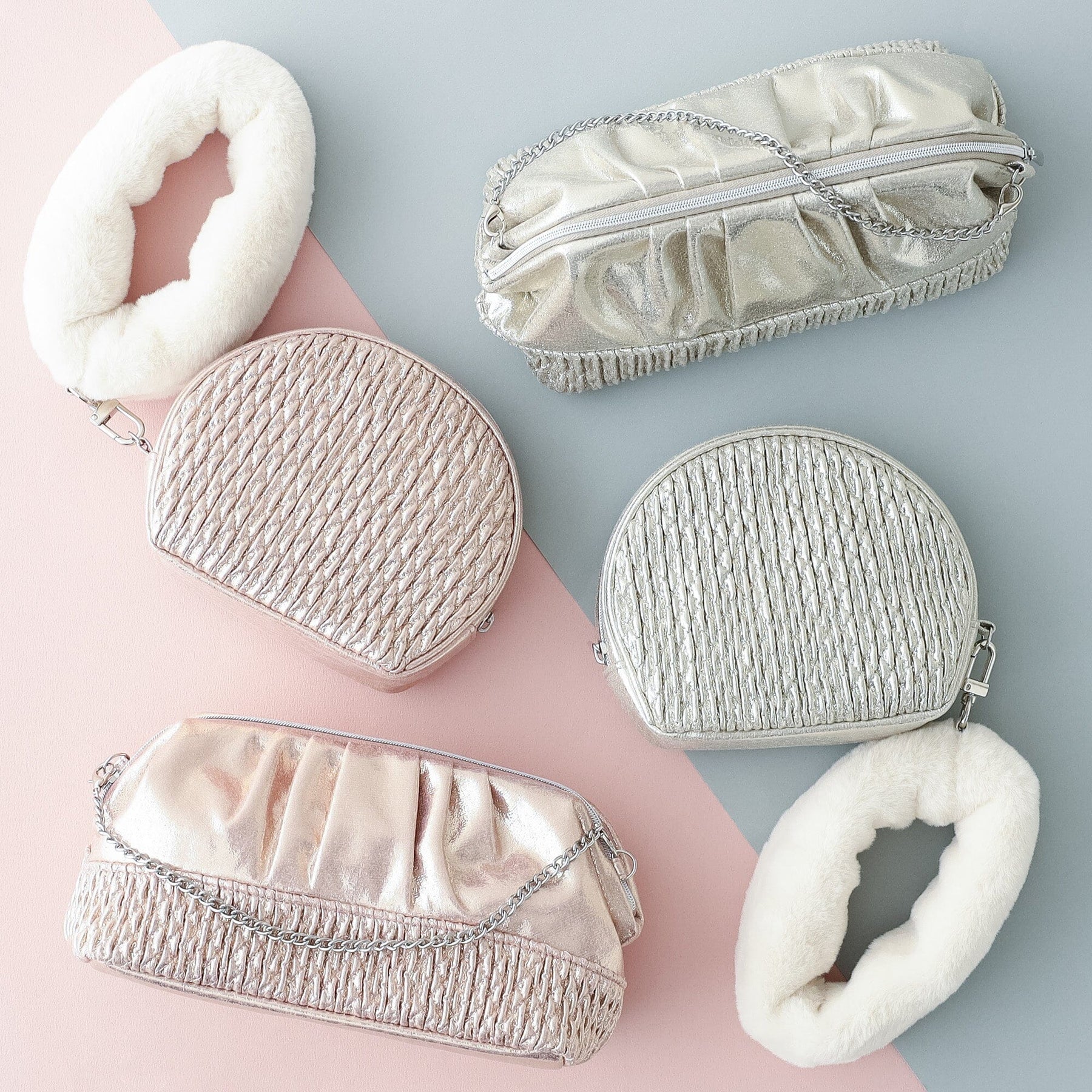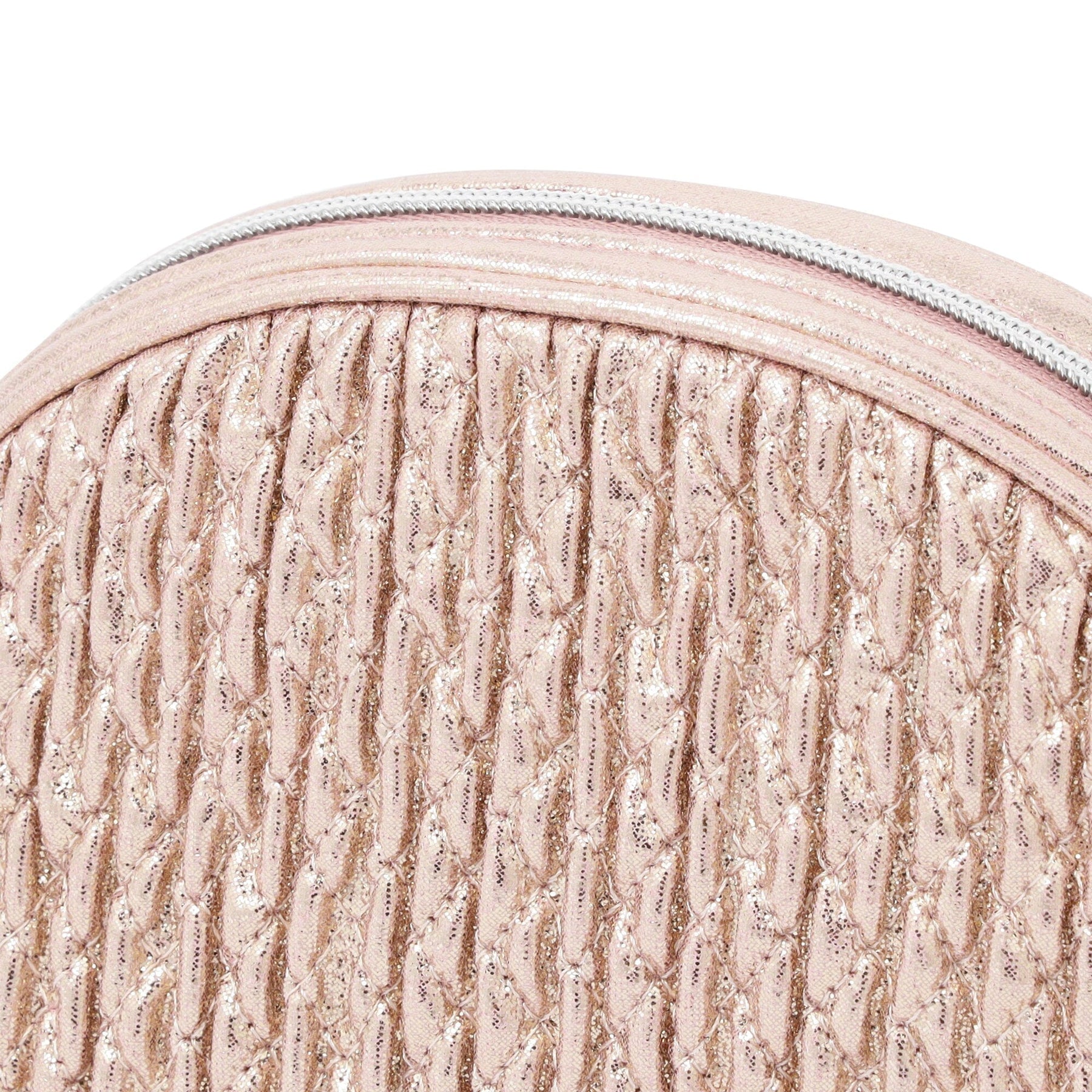 Made of glittery and metallic foil synthetic leather. The shirring adds a textured finish to the fabric, further enhancing its dazzling design.