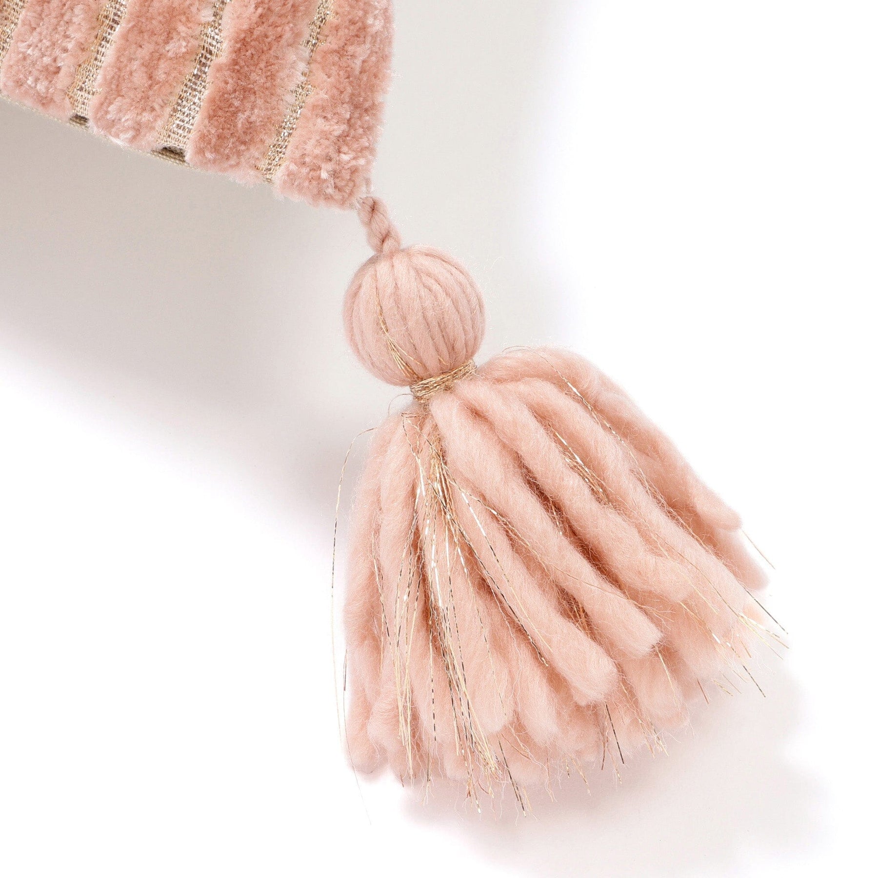 Material: Front: 90% Polyester, 10% Rayon, Back: 98% Cotton, 2% Recycled Fiber (Cellulose), Tassel: Pink - 60% Wool, 40% Acrylic, Gold - 100% Polyester