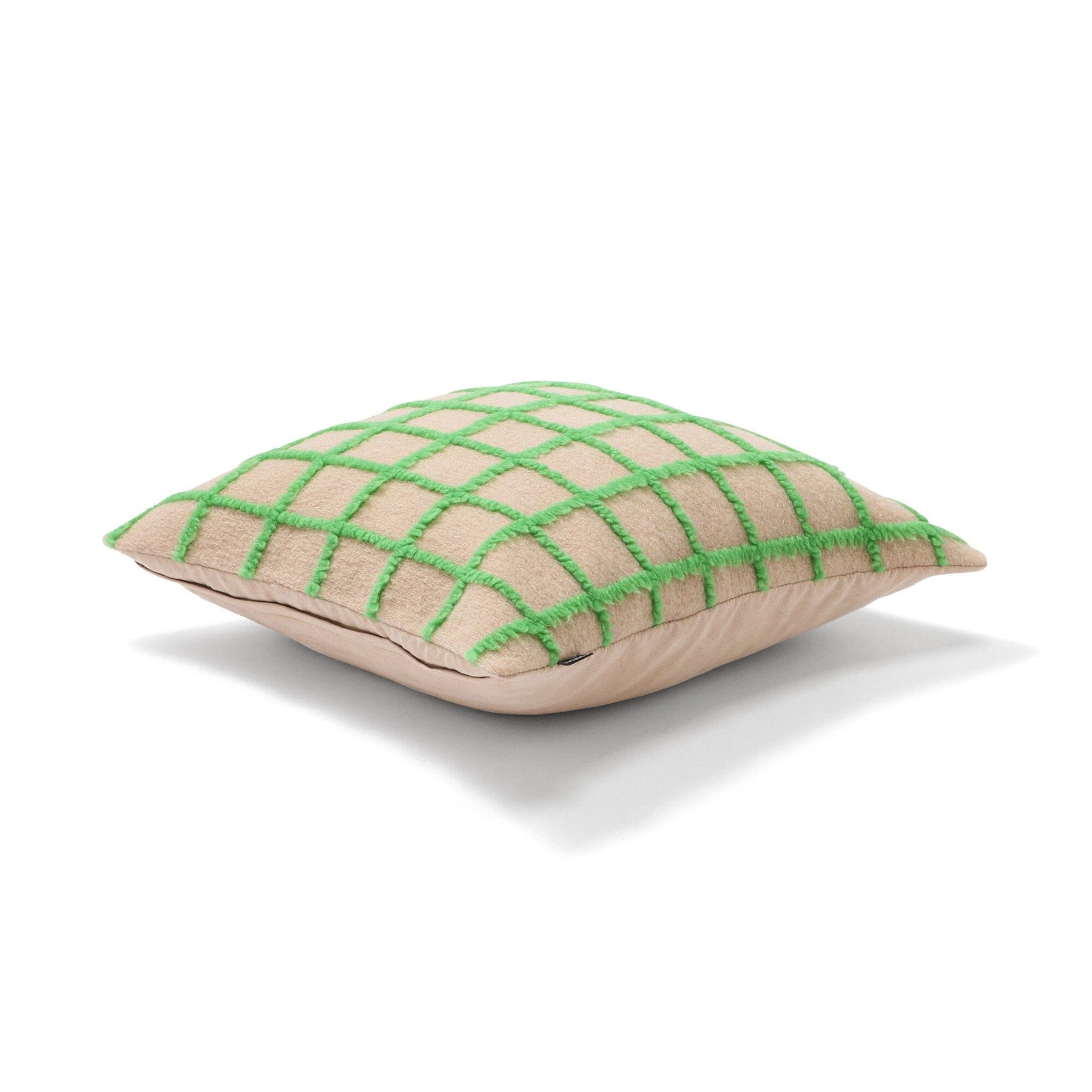 This cushion cover features a three-dimensional windowpane pattern made with soft, boa-like yarn.The beige base is accented with vibrant green lines, creating a design that adds just the right amount of individuality to a warm look.