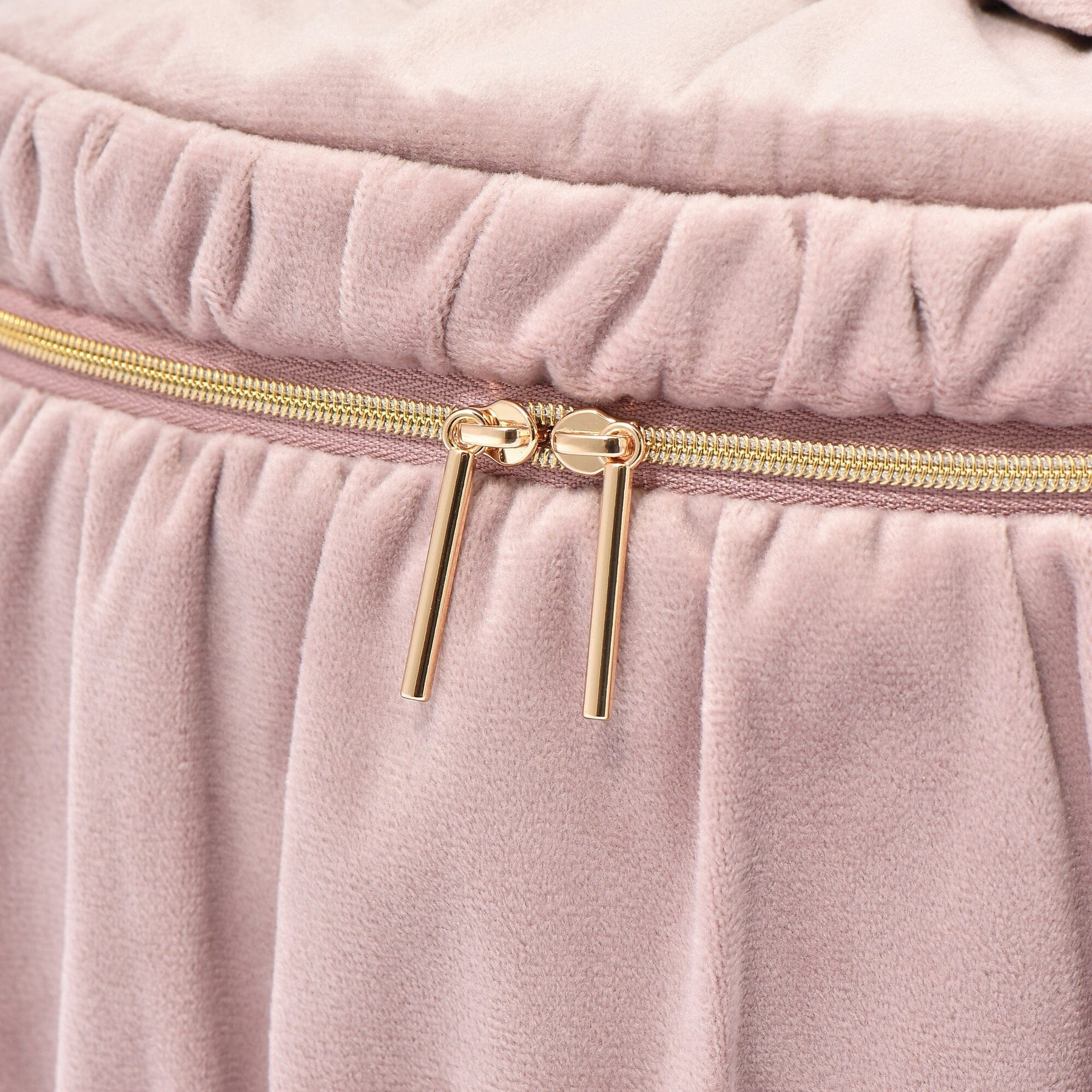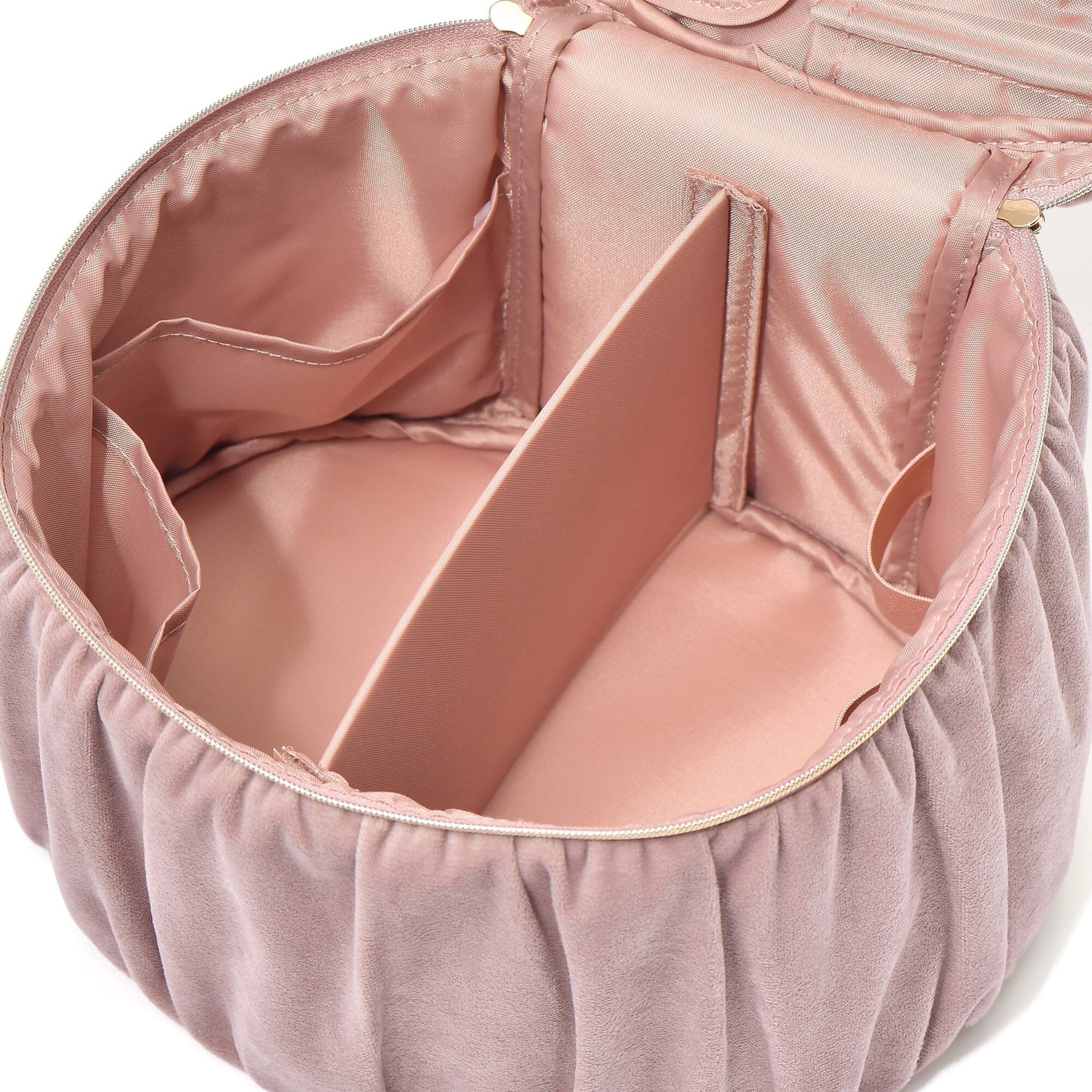 The vanity pouch features a cute circular design and gold handles for a touch of luxury.