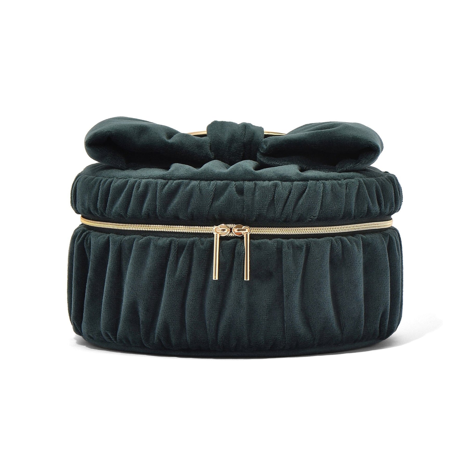 The vanity pouch has a cute circular design and gold handles for a touch of luxury.