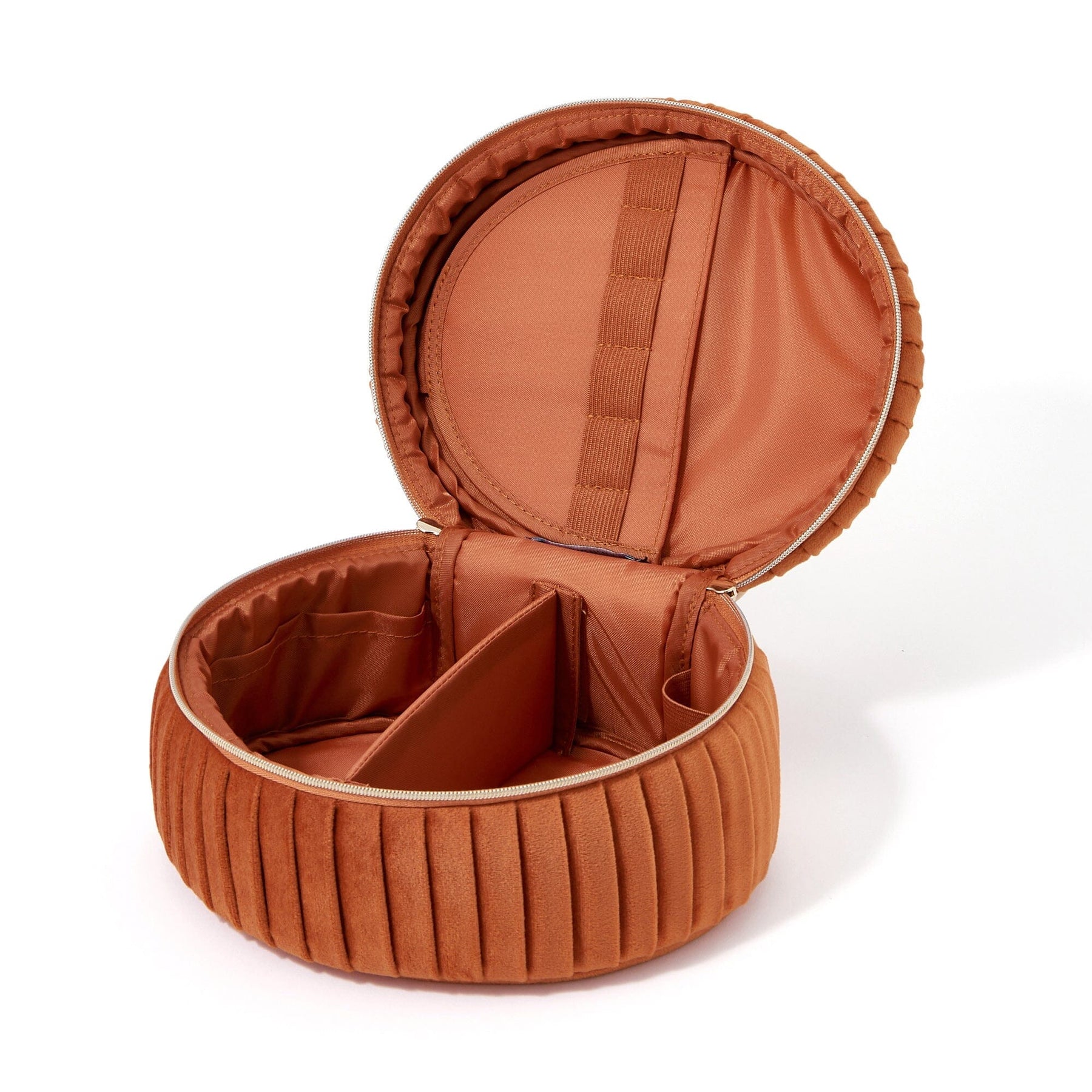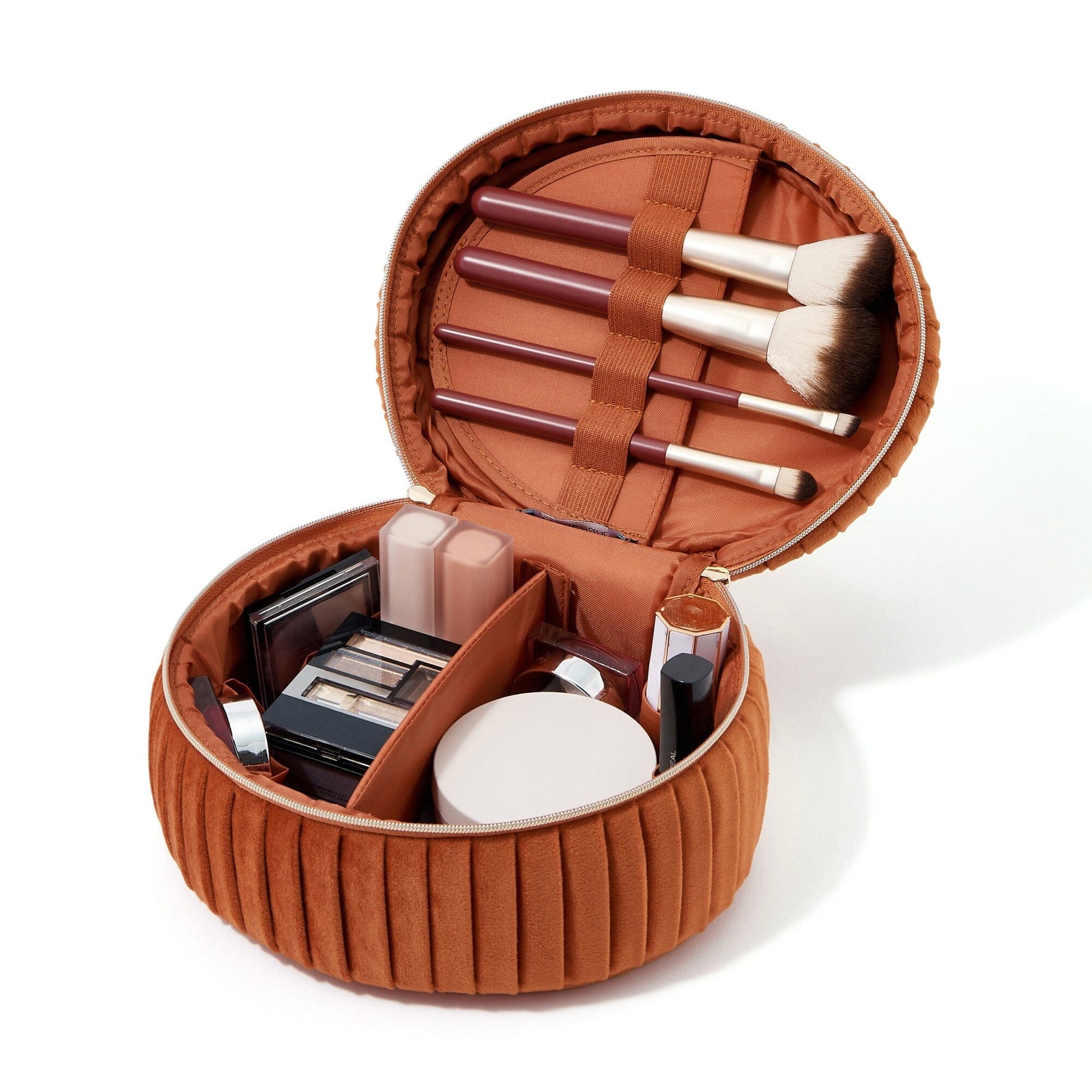 The vanity pouch features a playful oval shape, voluminous pleats, and a gold handle for a touch of luxury.