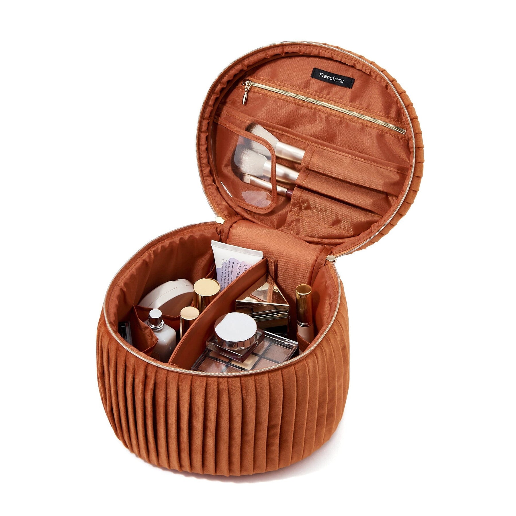 這款化妝袋採用俏皮的橢圓形、寬大的褶皺和金色手柄,營造出奢華的氣息。