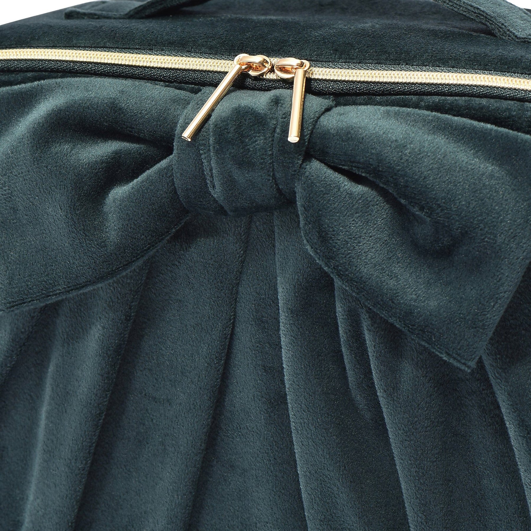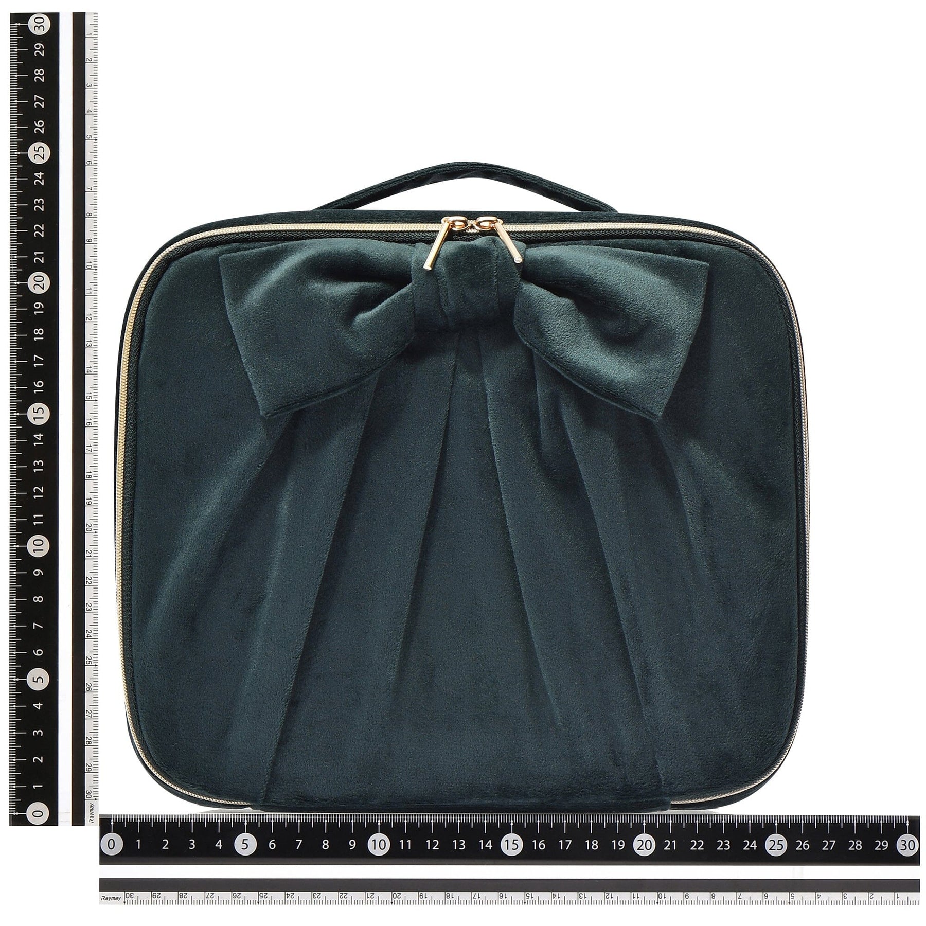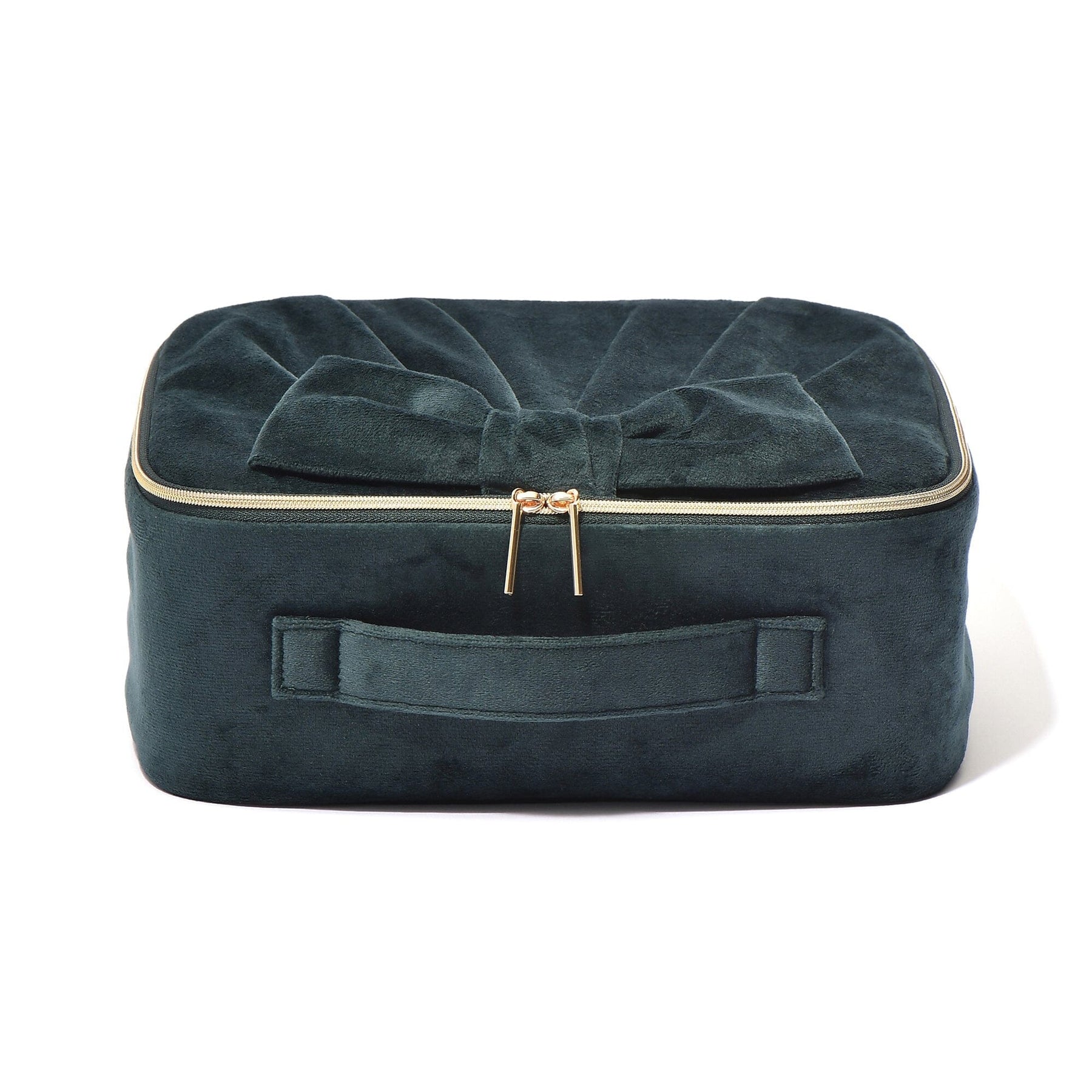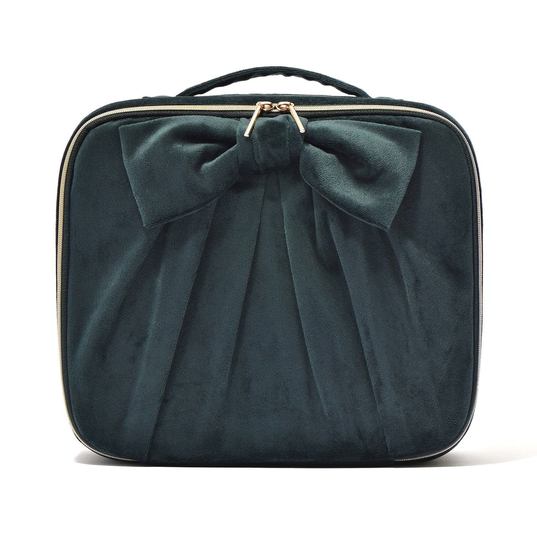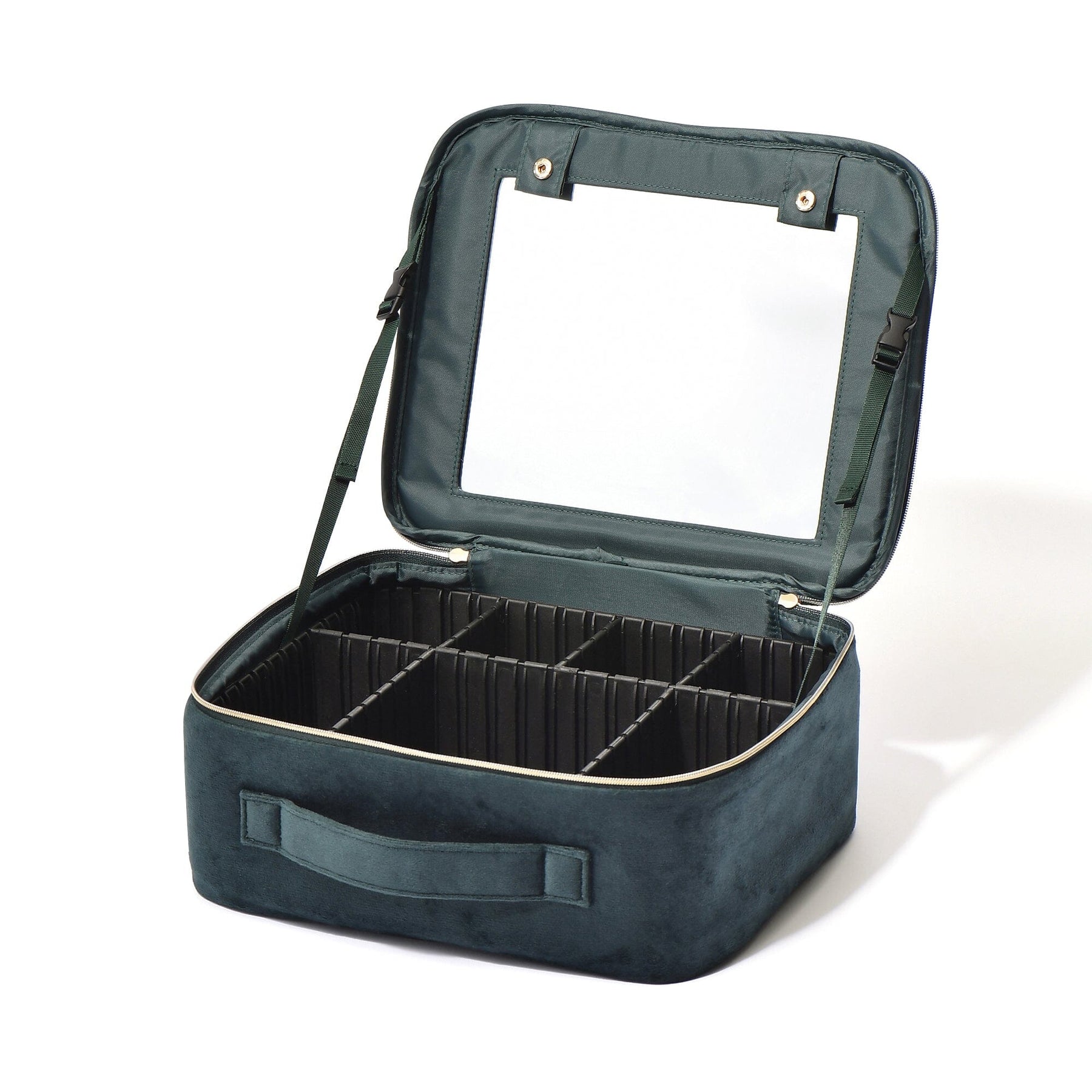 The lid features an angle-adjustable mirror and a removable brush holder, allowing you to use the bag as a dresser even when open.