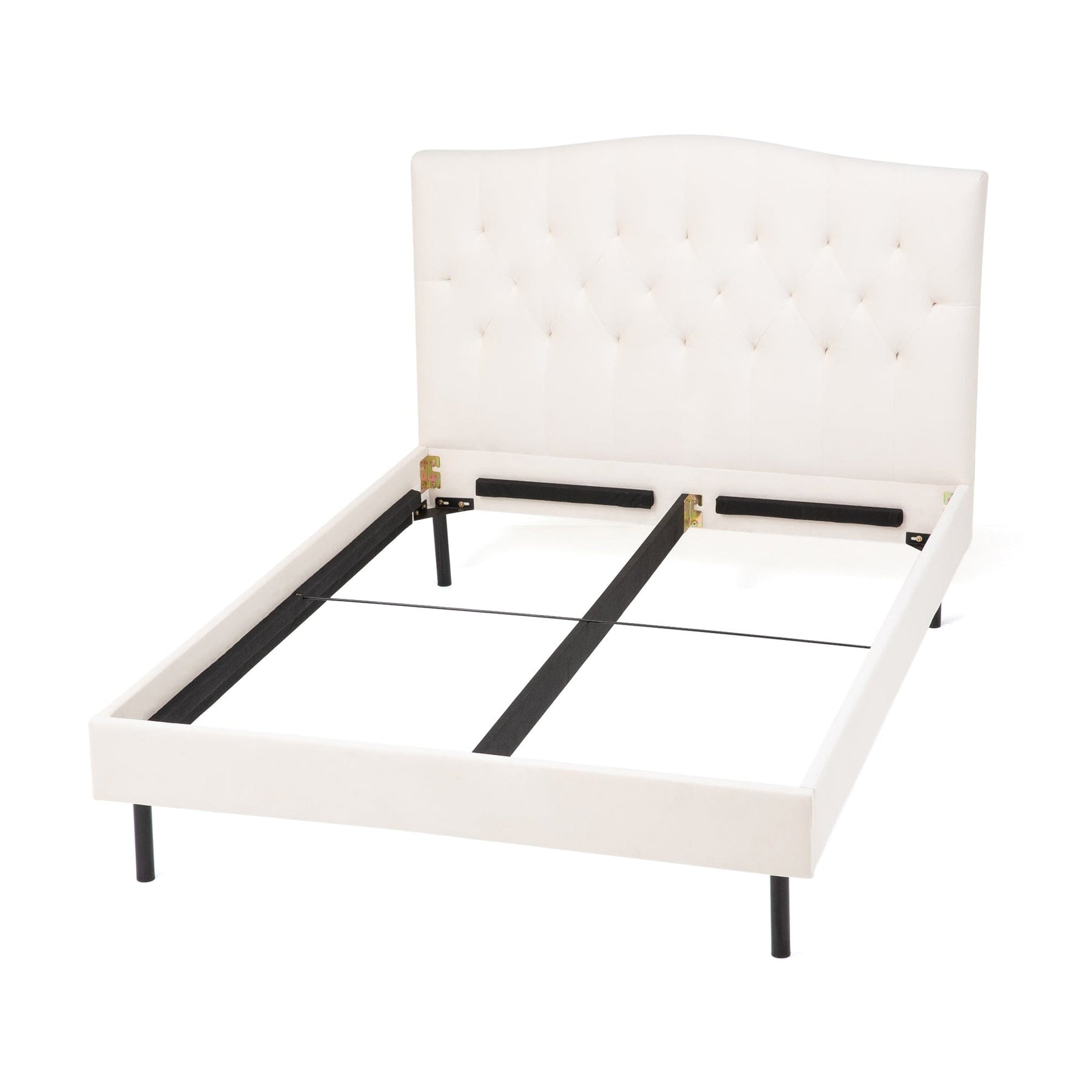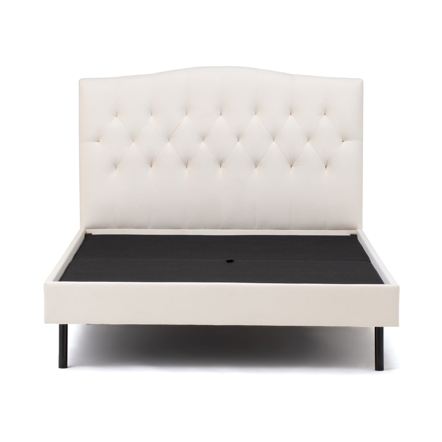 This bed frame is upholstered in an elegant, brushed fabric typical of Francfranc.