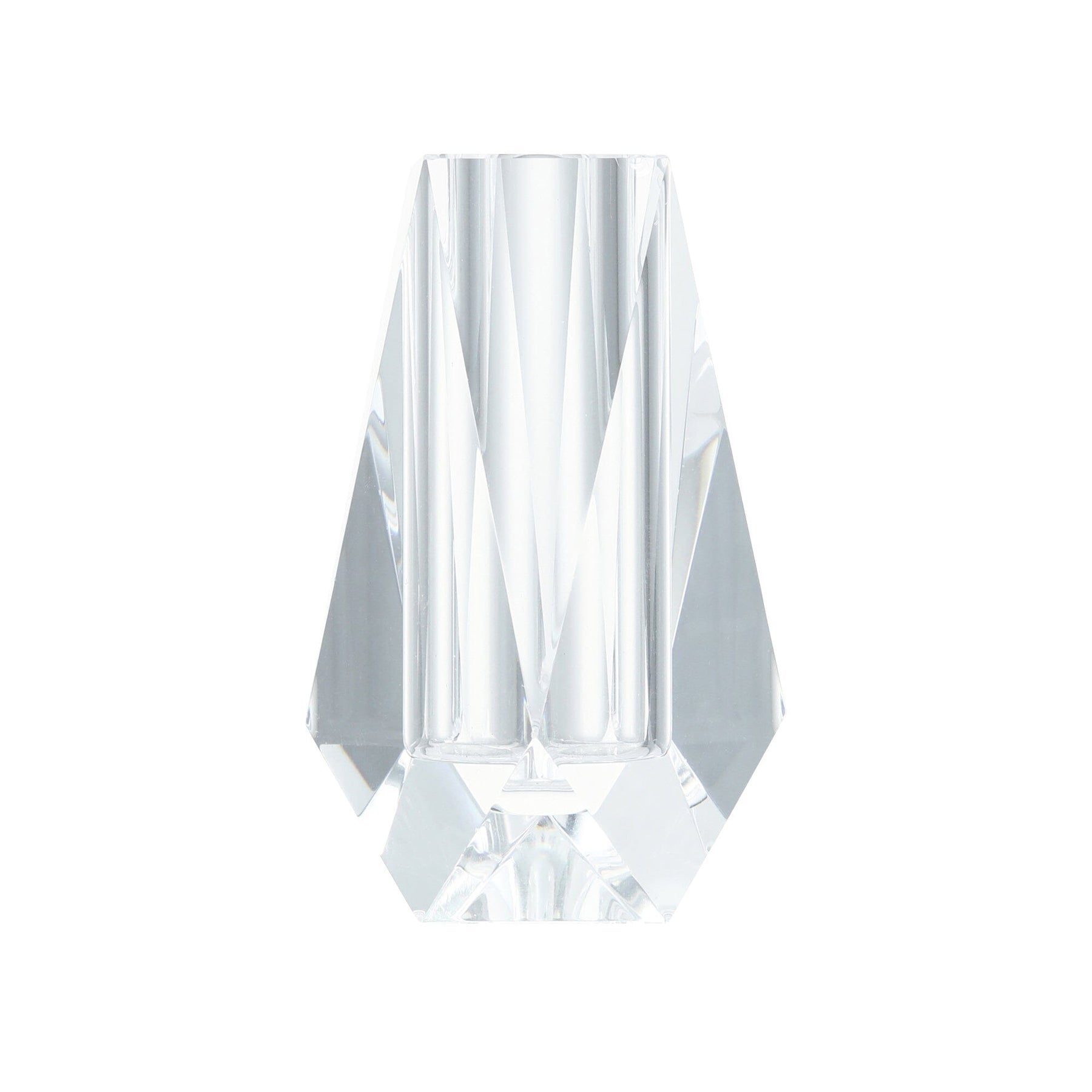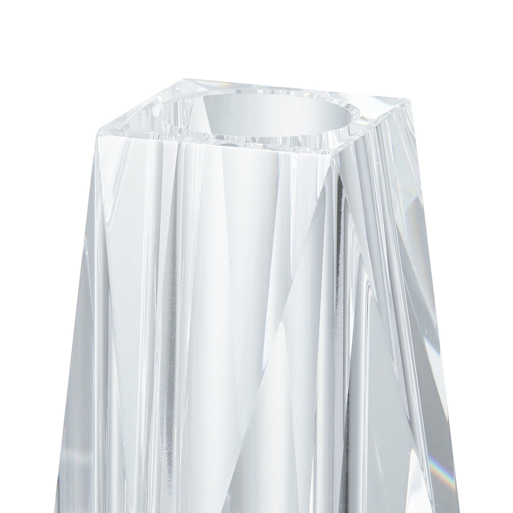 A glass flower vase with crystal cut details.Its sparkling appearance is created by the reflection of light.