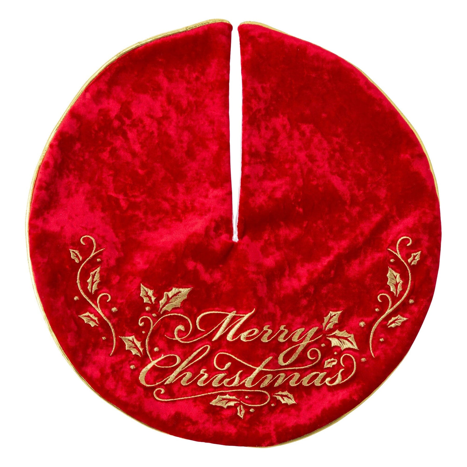 The tree skirt features luxurious embroidered velour. Its lustrous sheen adds a touch of elegance all the way down to the base of the tree.