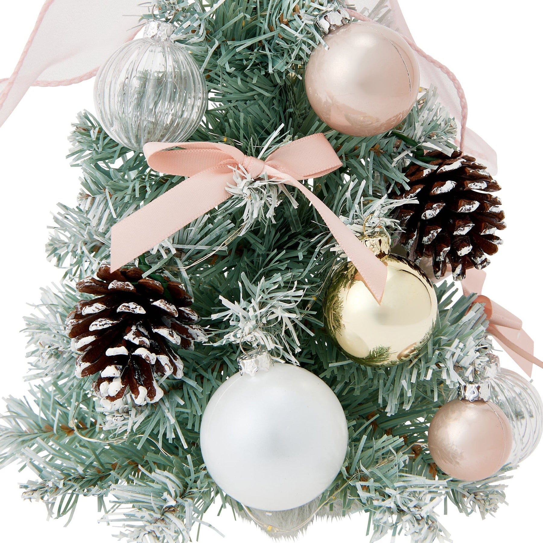 This desktop tree features a new design that's perfect for coordinating with other items.It's gorgeous with ornaments of various sizes. The lights sparkle with a delicate shine.