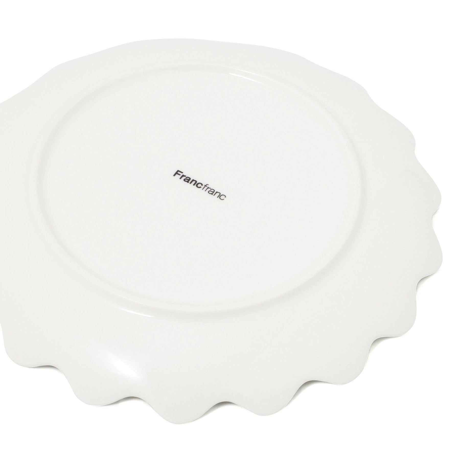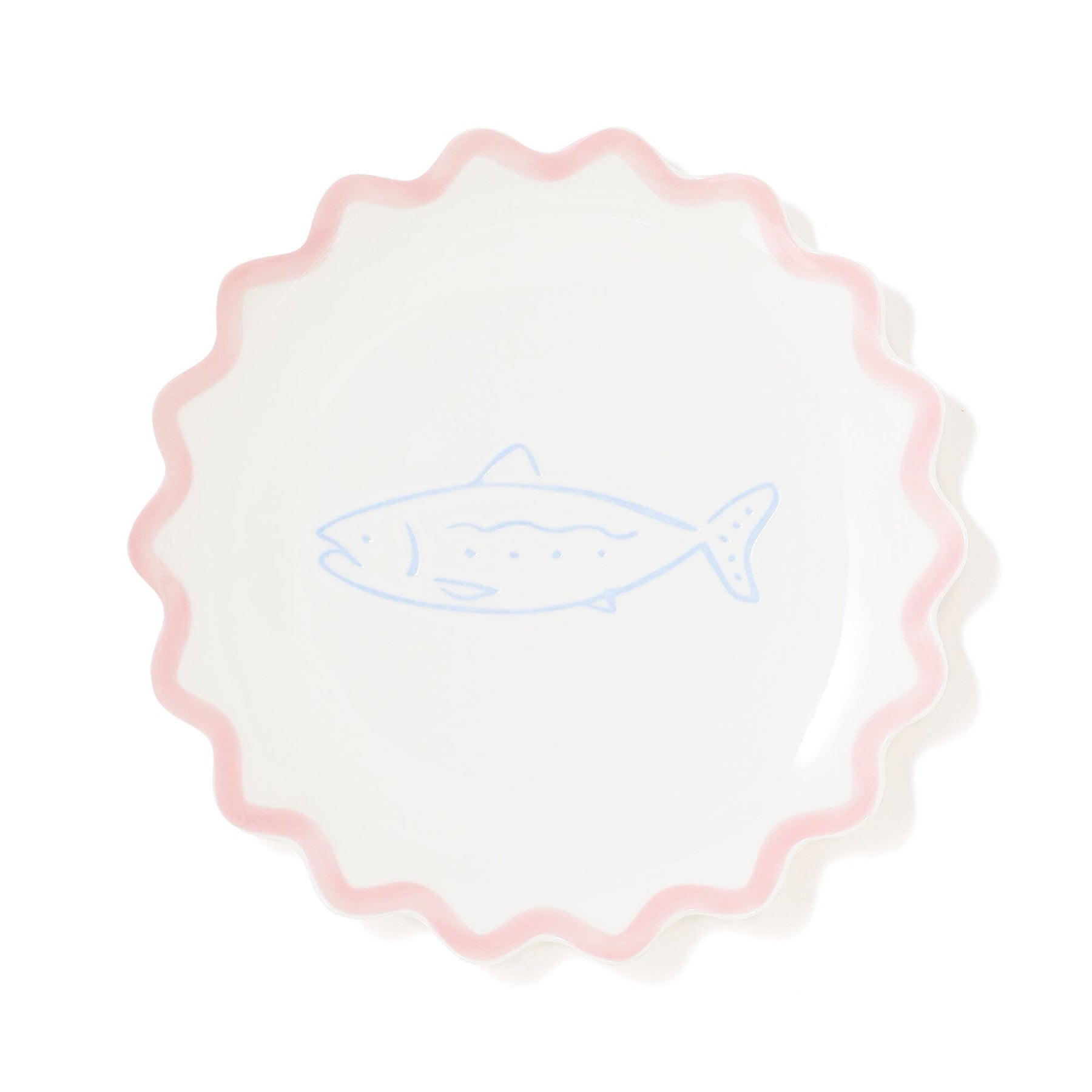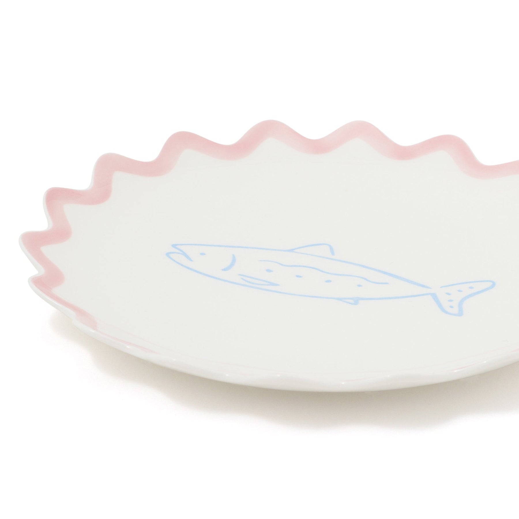 這是一個中等大小的盤子,採用波浪形設計,上面有海洋生物的插圖。