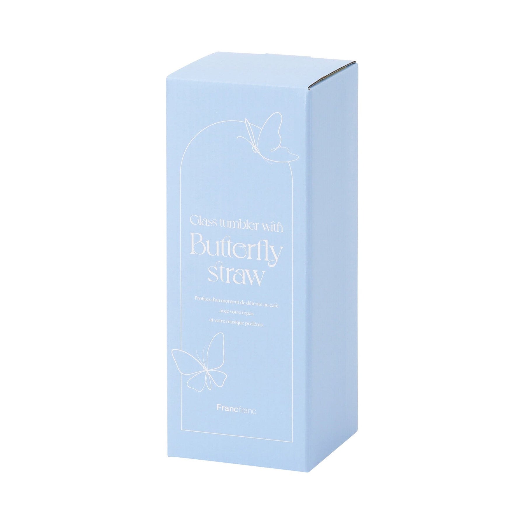 A glass tumbler with a cute butterfly motif and a straw.The photogenic design means you can enjoy a "stunning" home café by pouring your favorite drink into it.