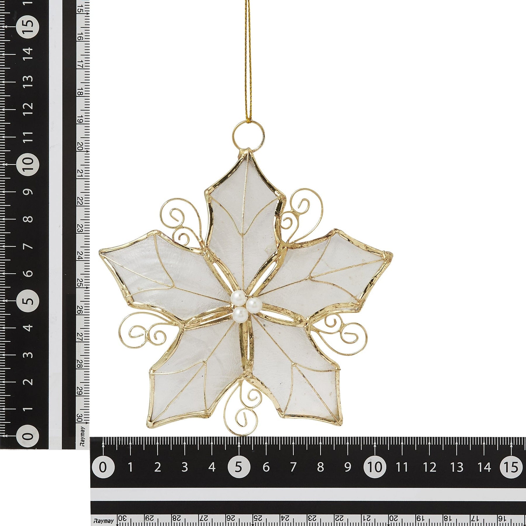 This ornament features a delicate holly leaf, a classic Christmas motif, crafted from capiz shell.