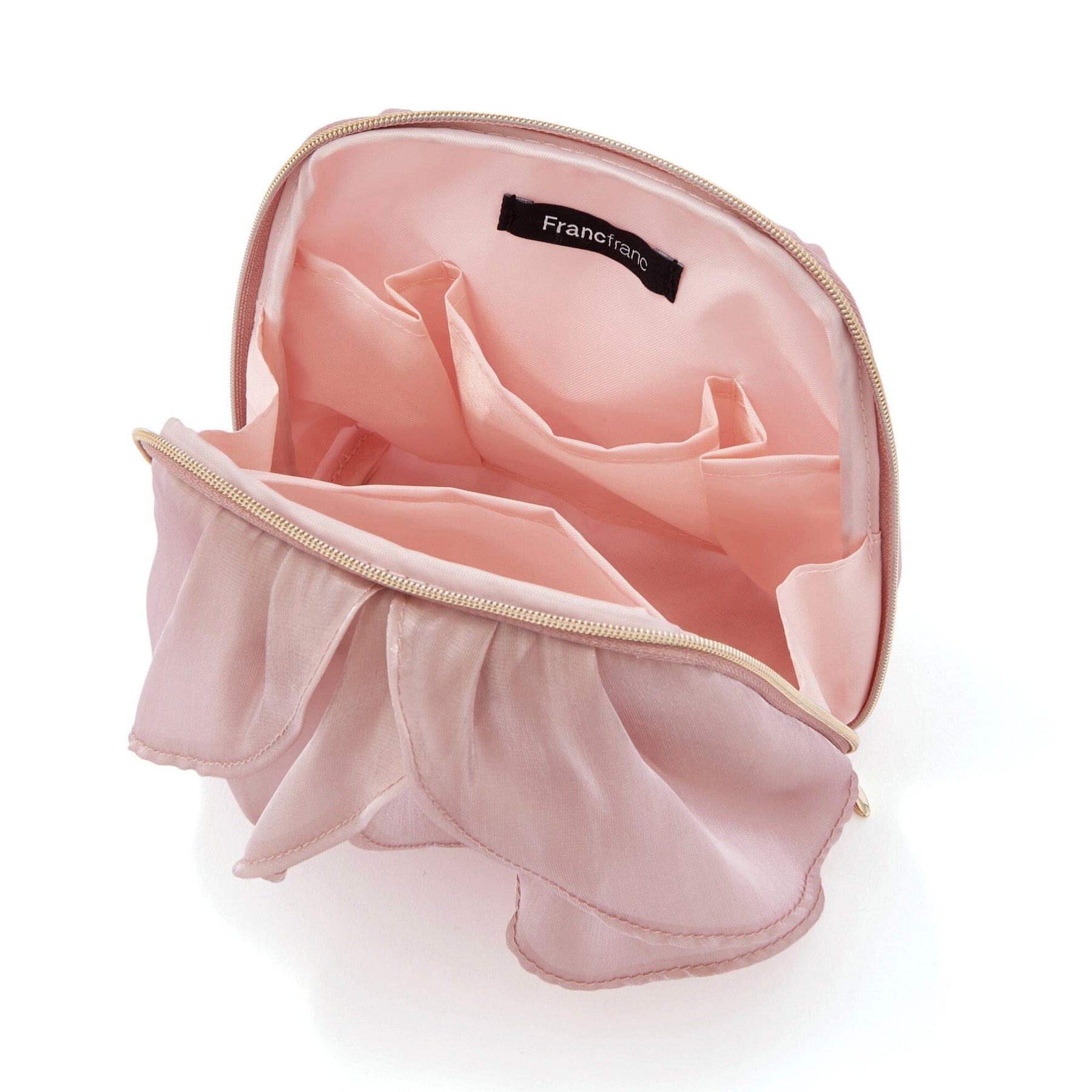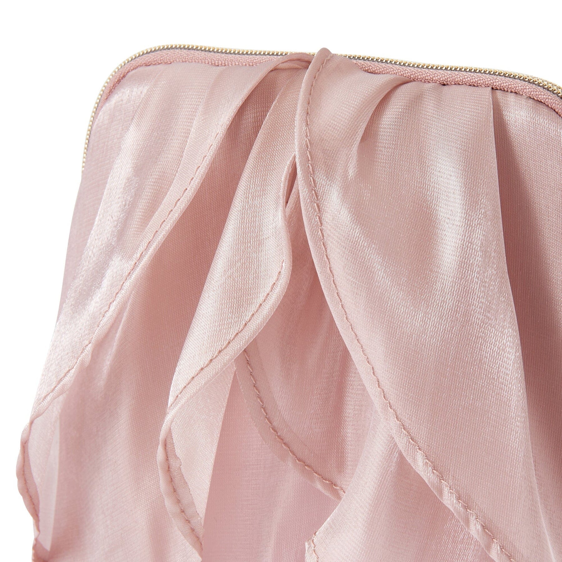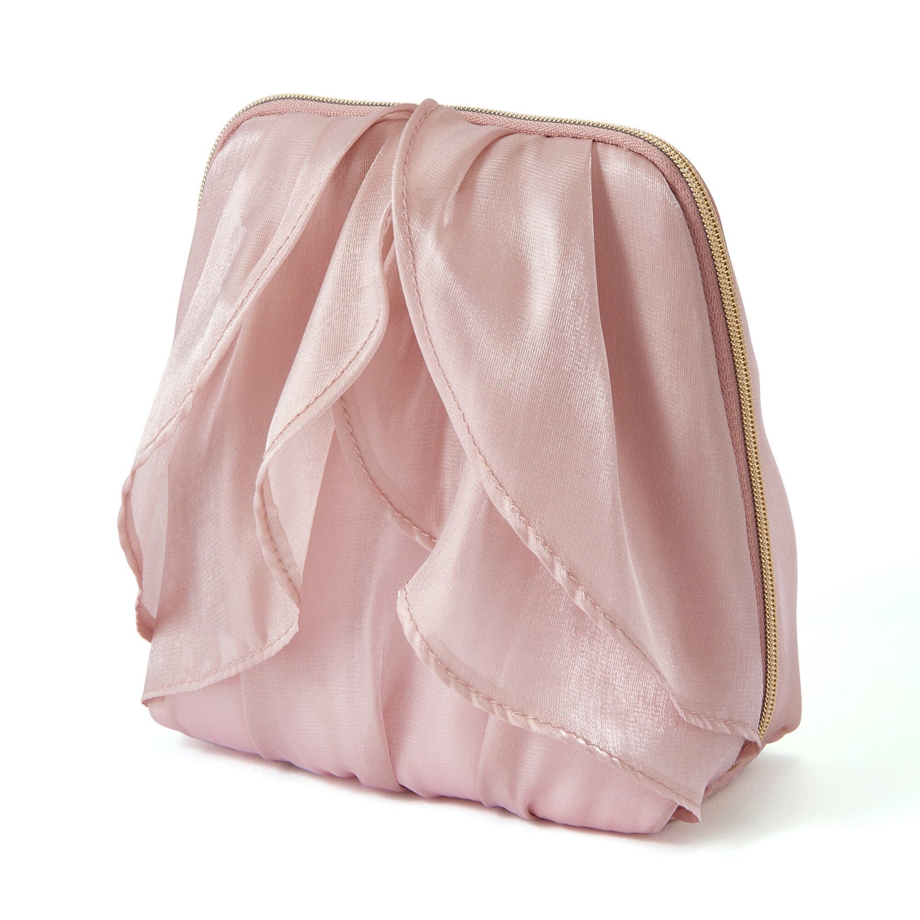 This pouch features fluttering organza ruffles to create a floral design.