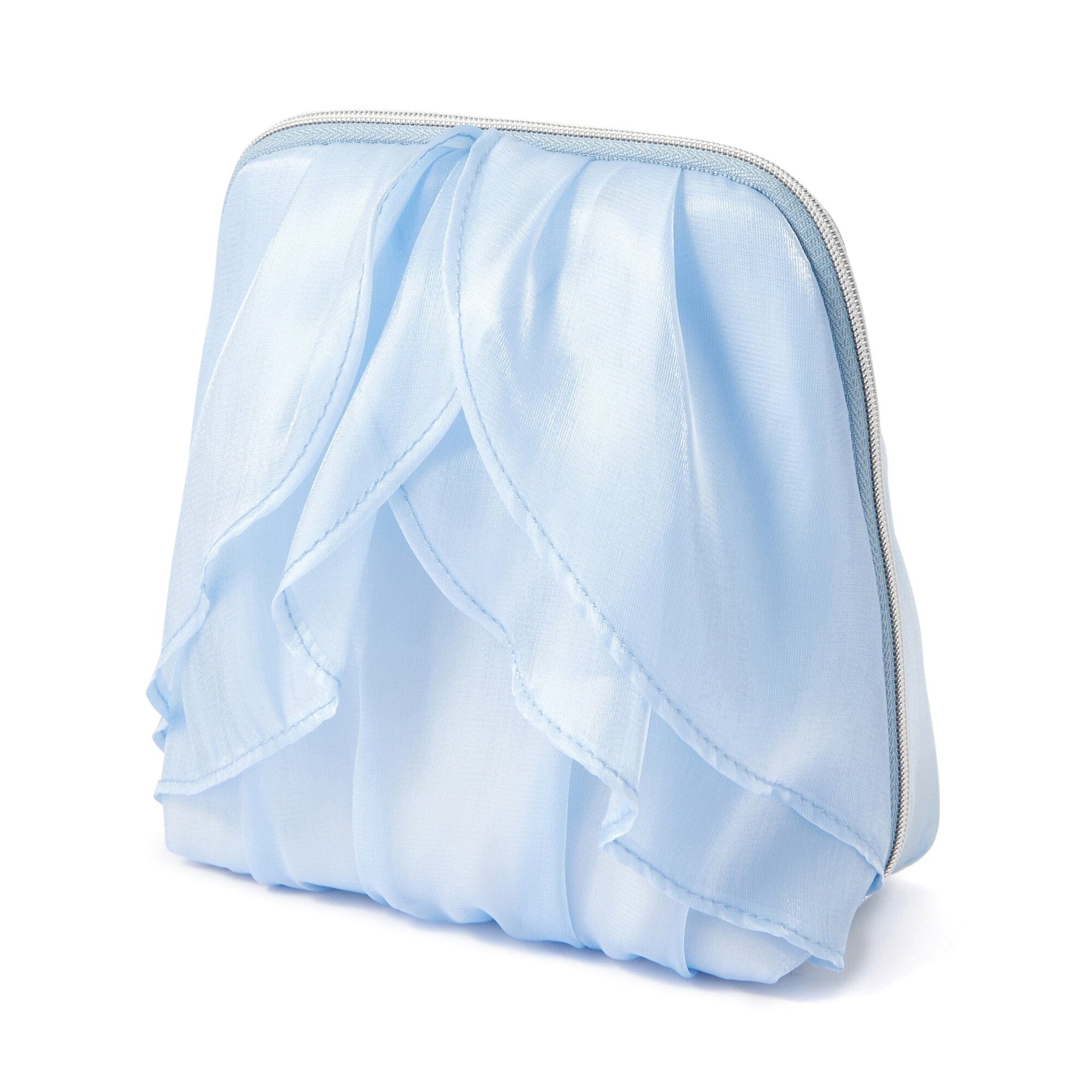 This pouch features fluttering organza ruffles to create a floral design.The sheer, glossy organza fabric creates a fresh, spring-like impression.
