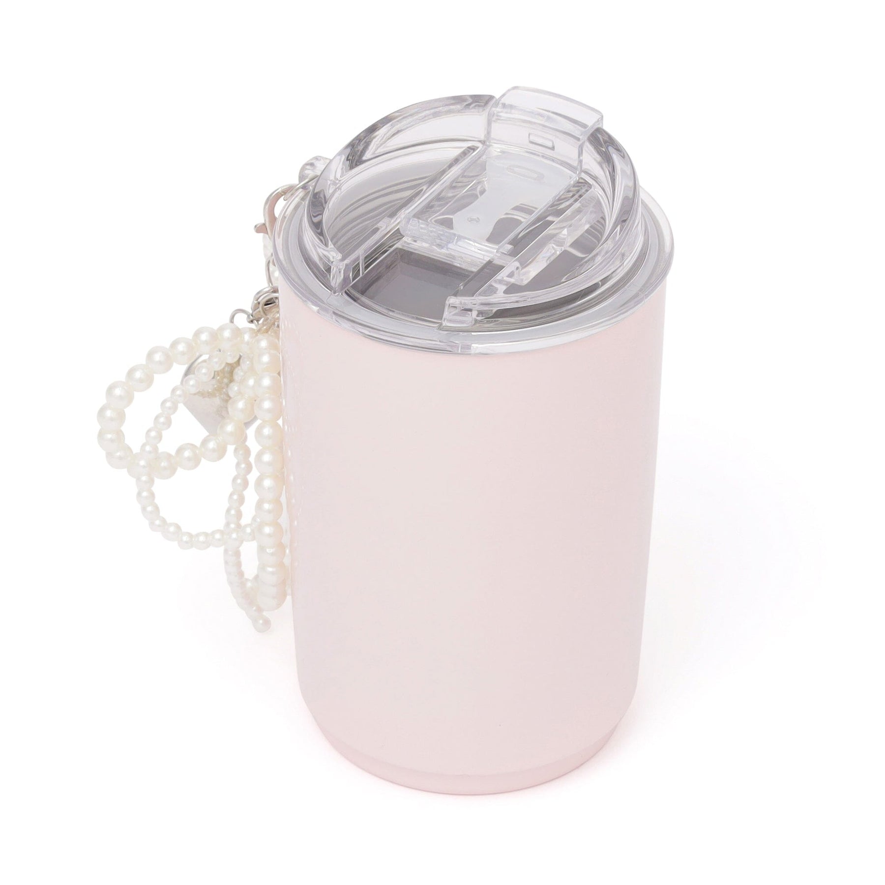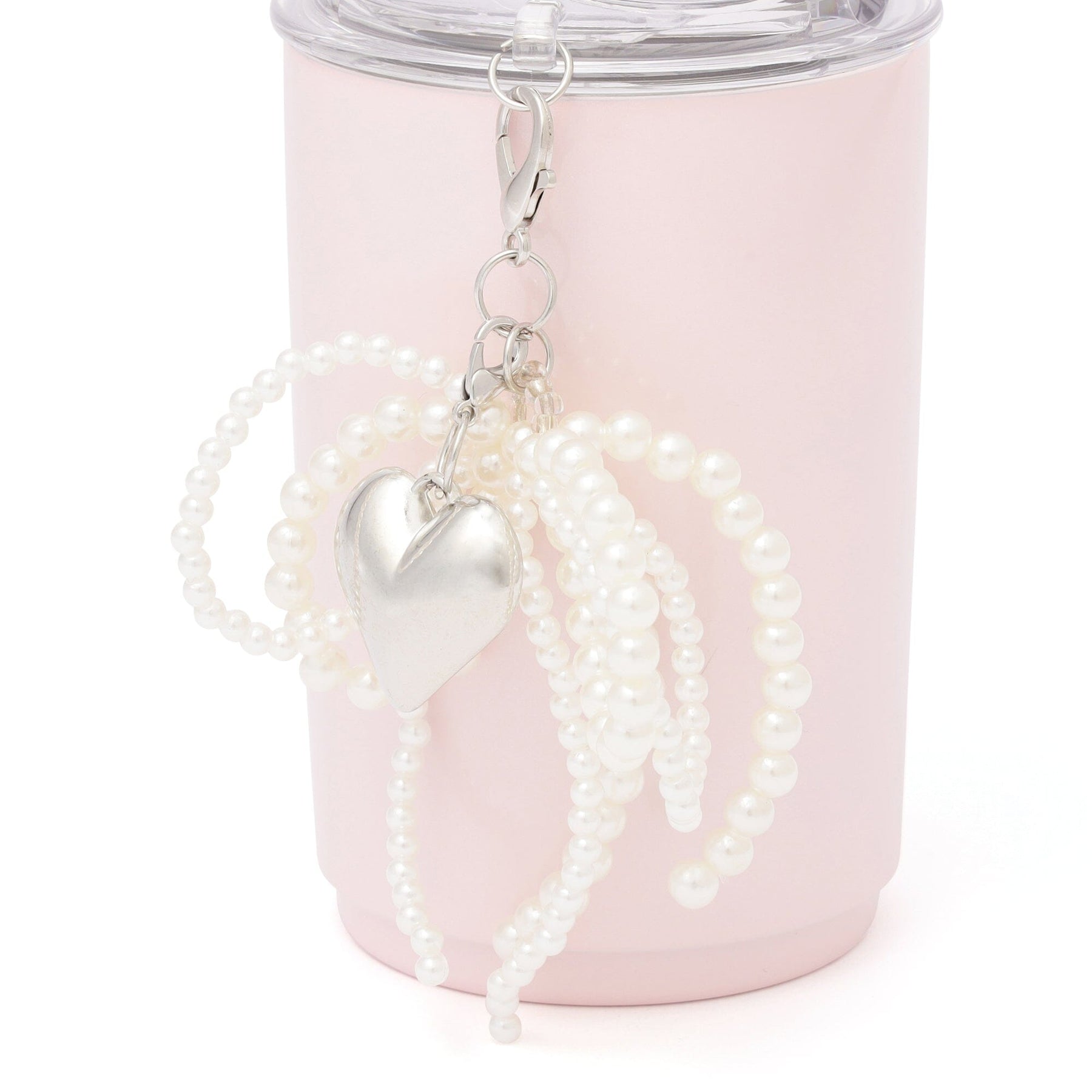 This stainless steel tumbler features a trendy pearl ribbon and heart charm.